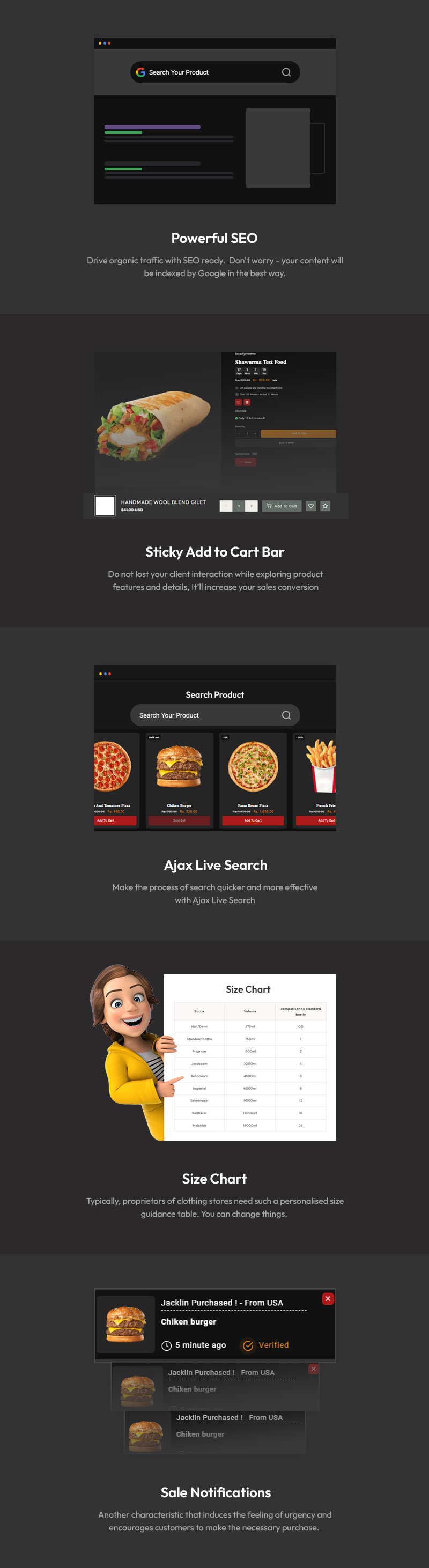 With Brooklyn’s easy drag-and-drop customization, you can personalize colors, fonts, and layouts to match your restaurant’s branding effortlessly. The advanced mega menu allows for organized and user-friendly navigation, making it simple for customers to browse categories like combos, beverages, special offers, and bestsellers. High-resolution product displays, video integration, and zoom-in effects ensure that your dishes look as irresistible online as they do in person.