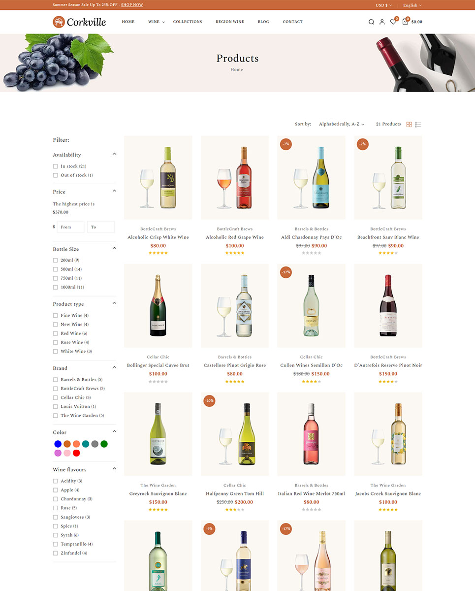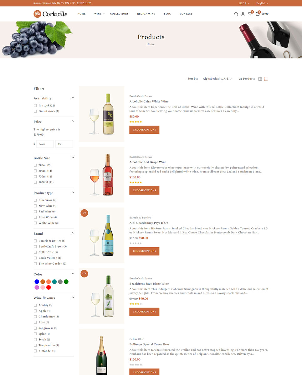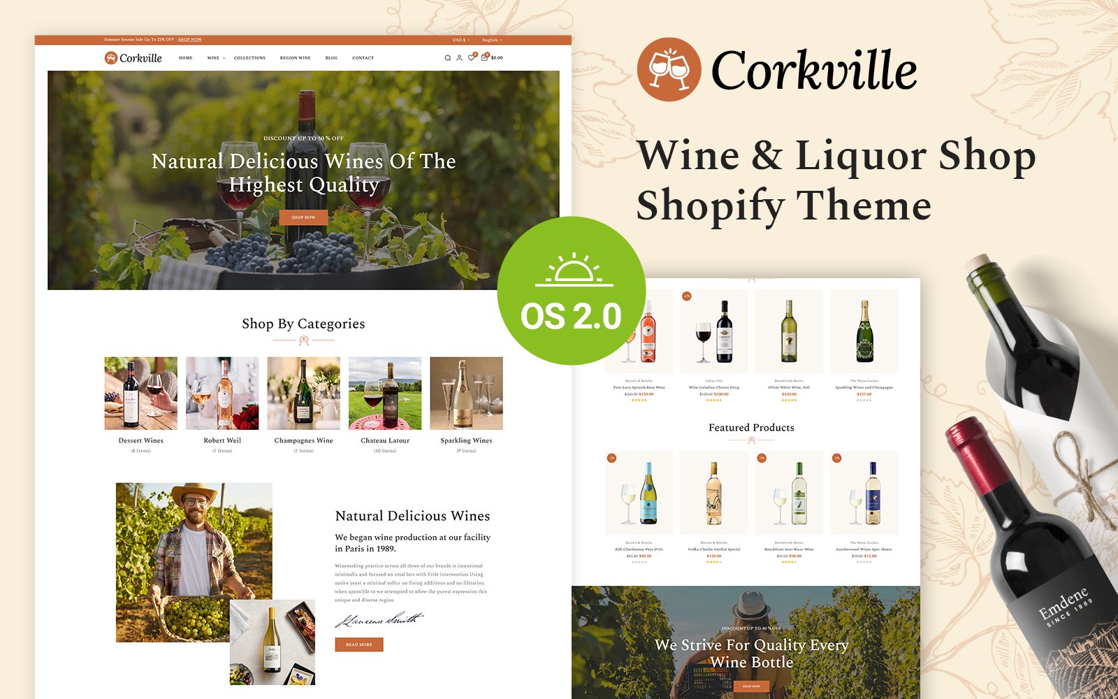Corkville, the Shopify 2.0 Responsive Theme meticulously crafted to transform your wine and liquor store into a digital haven for connoisseurs. Corkville boasts an exquisite design that harmonizes elegance with functionality. From the rich color palette to the tastefully designed layout, your online store will reflect the refined nature of the spirits you offer. Embrace the future of e-commerce with the power of Shopify 2.0. Corkville ensures your online store is equipped with the latest features, offering faster load times, enhanced navigation, and an overall polished interface that sets you apart in the competitive world of online liquor retail.