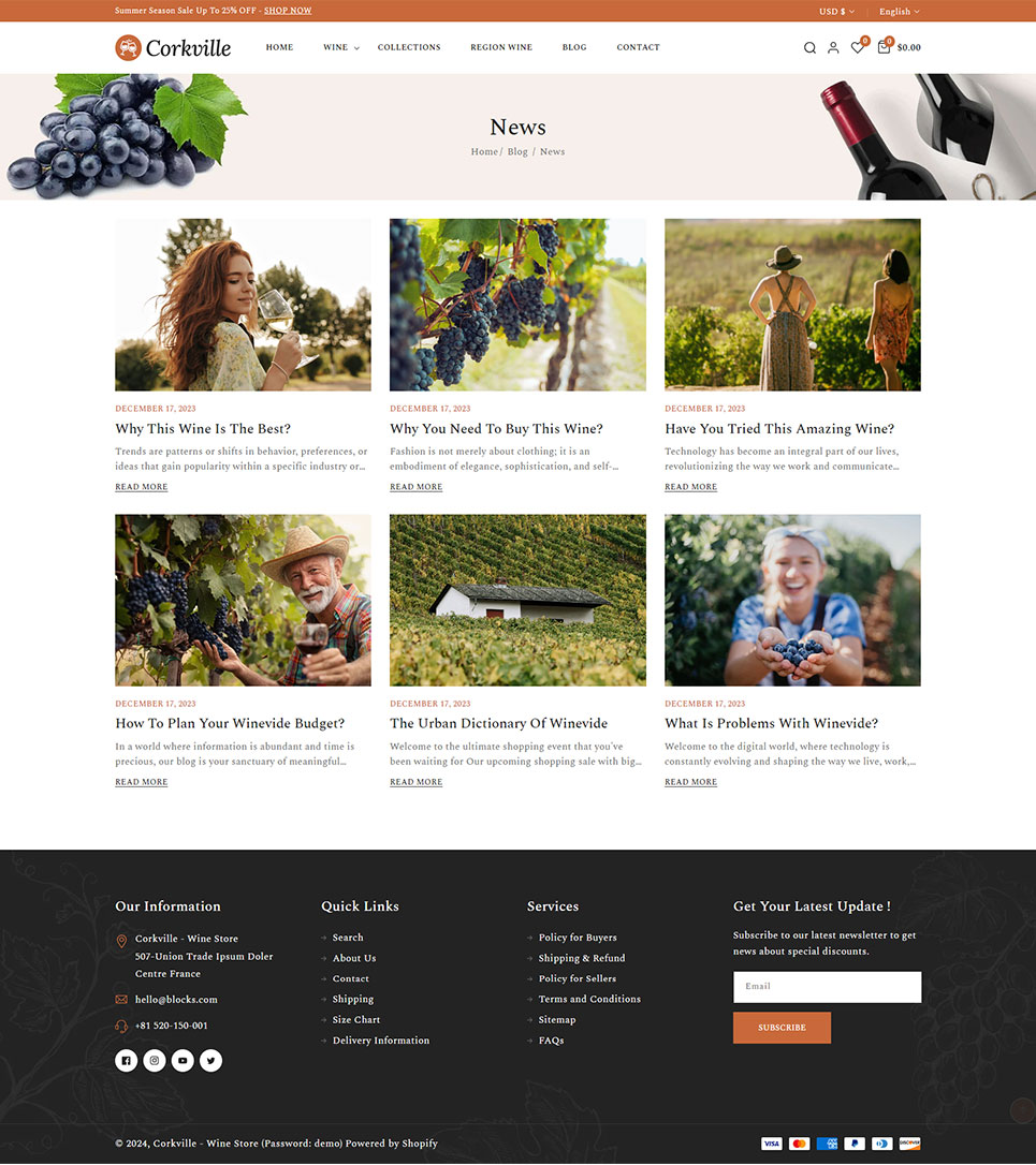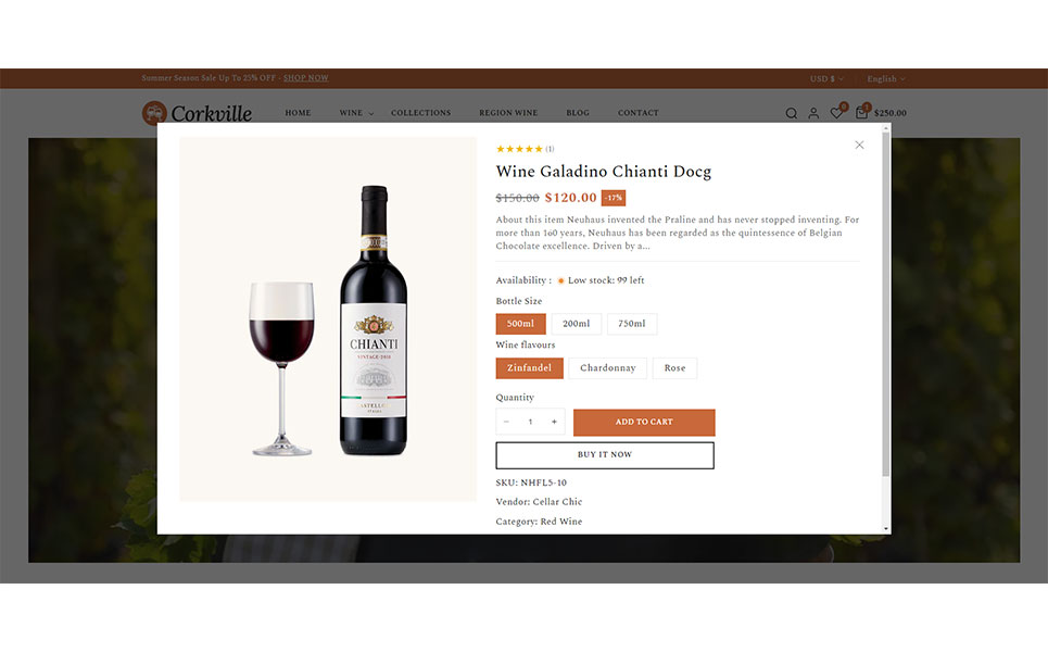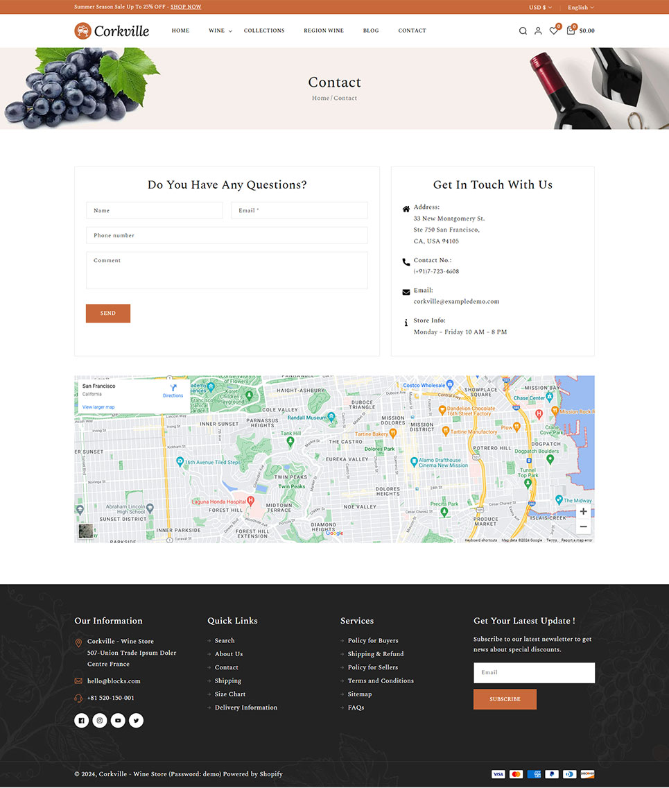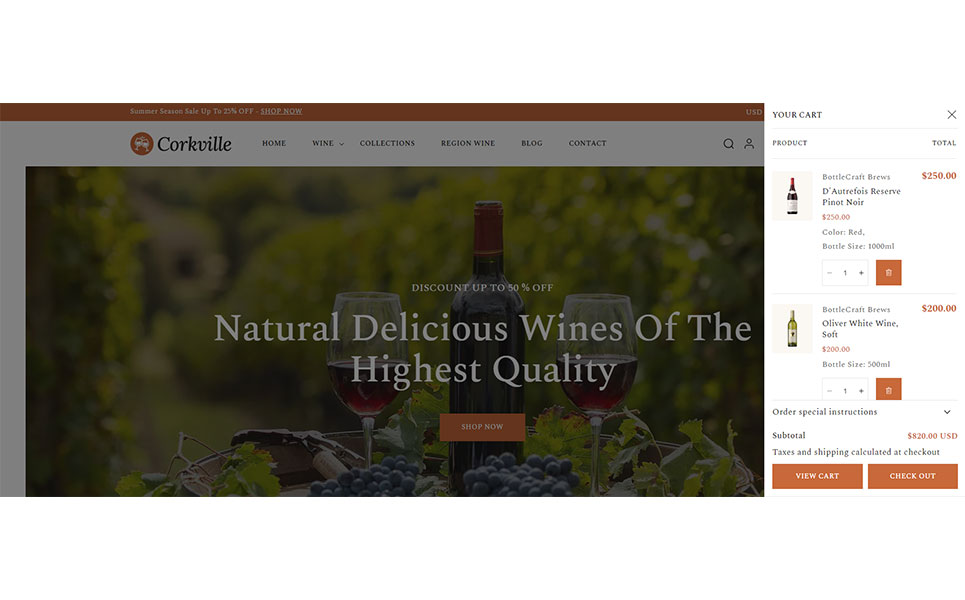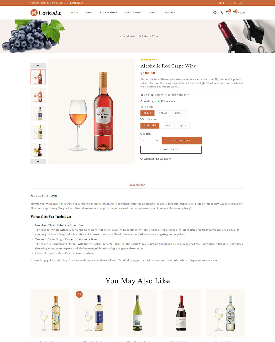 Corkville, the Shopify 2.0 Responsive Theme meticulously crafted to transform your wine and liquor store into a digital haven for connoisseurs. Corkville boasts an exquisite design that harmonizes elegance with functionality. From the rich color palette to the tastefully designed layout, your online store will reflect the refined nature of the spirits you offer. Embrace the future of e-commerce with the power of Shopify 2.0. Corkville ensures your online store is equipped with the latest features, offering faster load times, enhanced navigation, and an overall polished interface that sets you apart in the competitive world of online liquor retail.