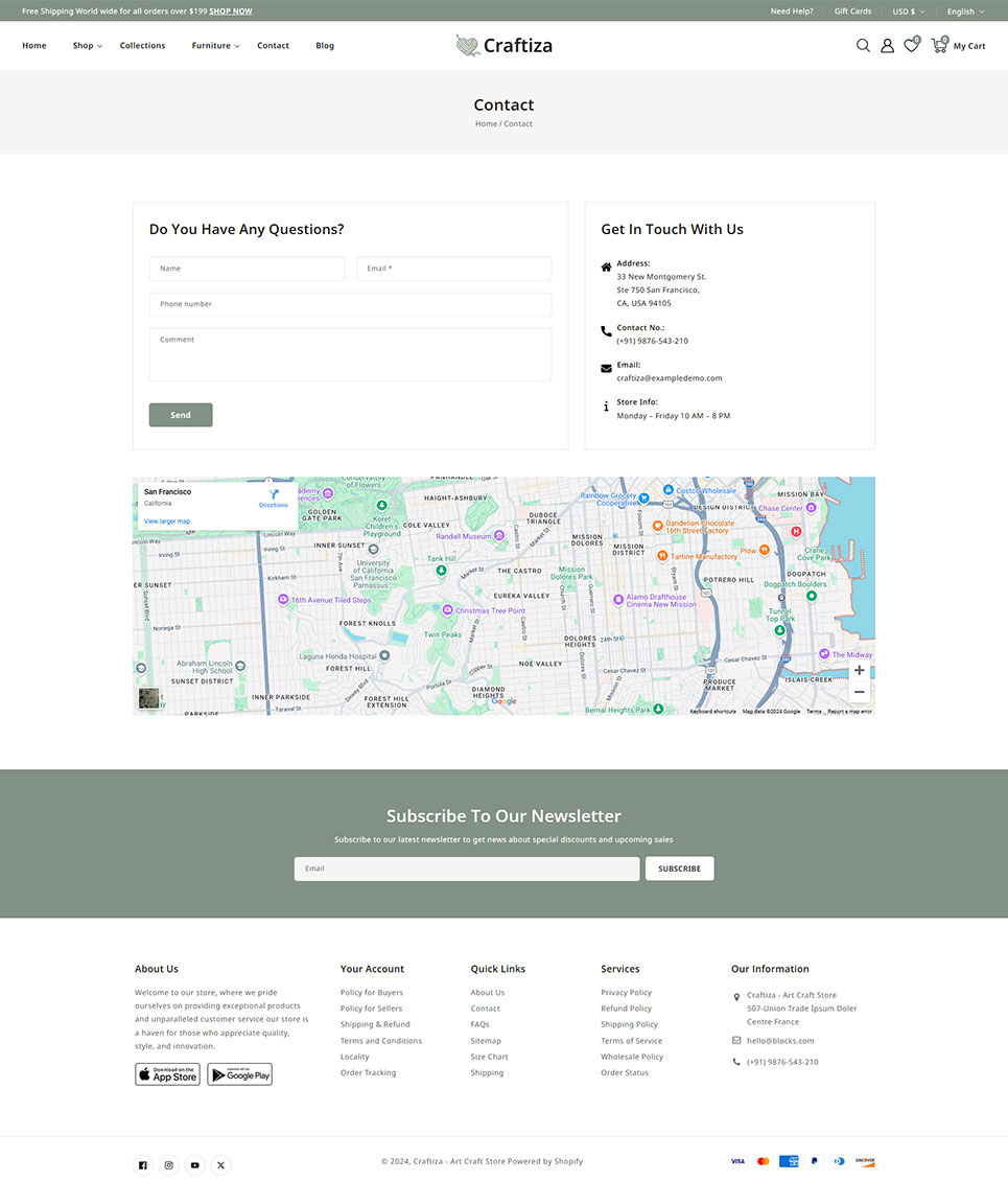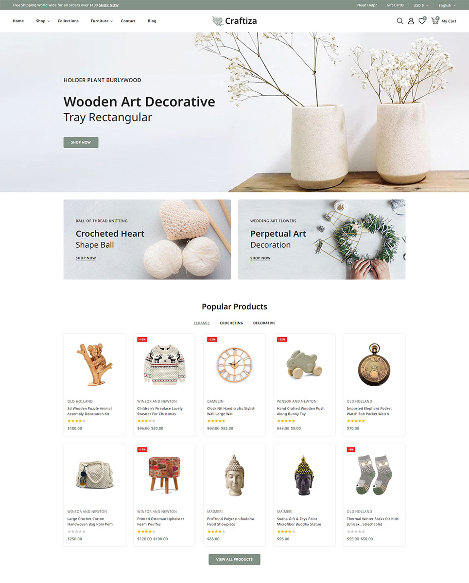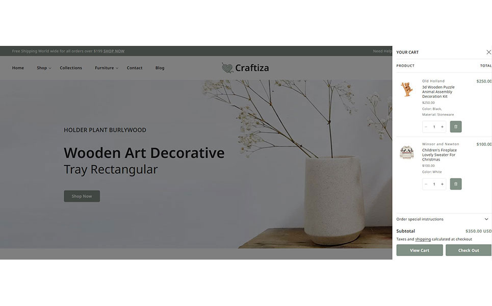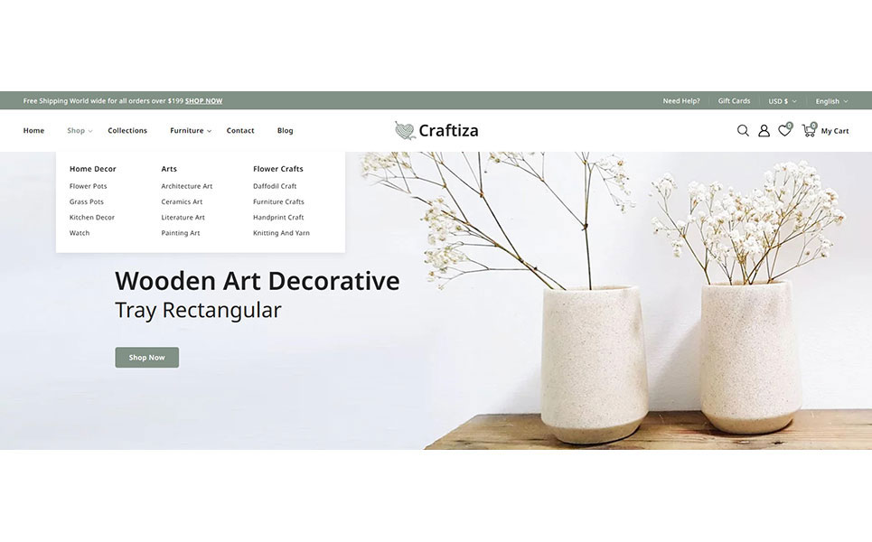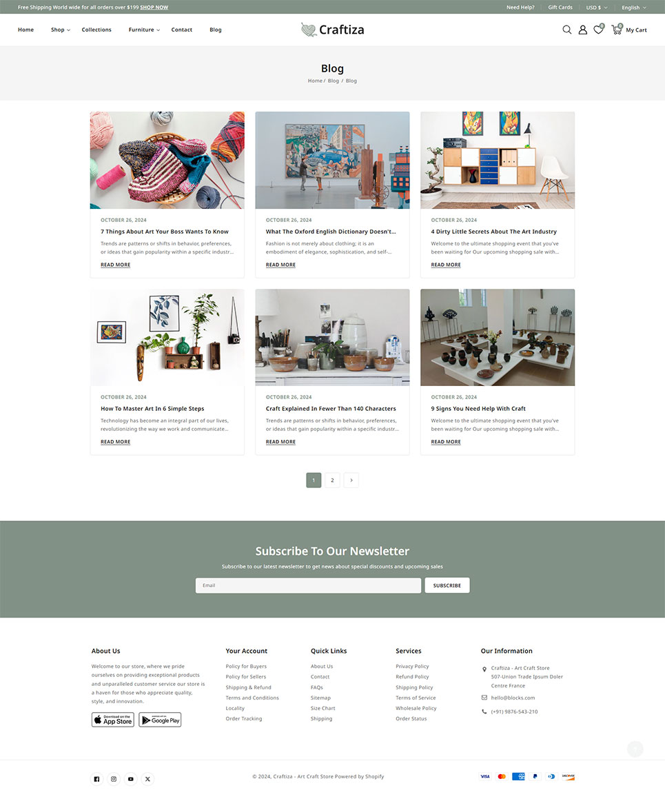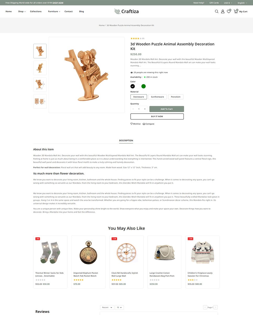 Craftiza is a beautifully designed Shopify 2.0 Responsive Theme crafted exclusively for handmade, artistic, and craft product stores. Whether you're selling pottery, home décor, artisanal goods, or DIY art supplies, Craftiza provides the perfect visual elegance and functional depth to showcase your products with style and creativity. Tailored for small businesses, artists, and craft entrepreneurs, this theme brings together artistic design and powerful eCommerce features to help you grow your online brand with confidence.