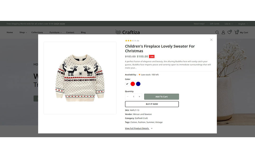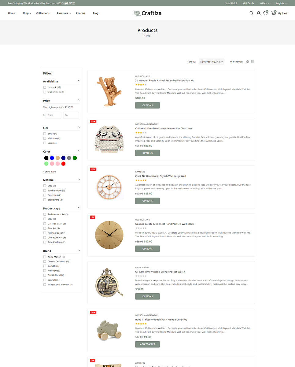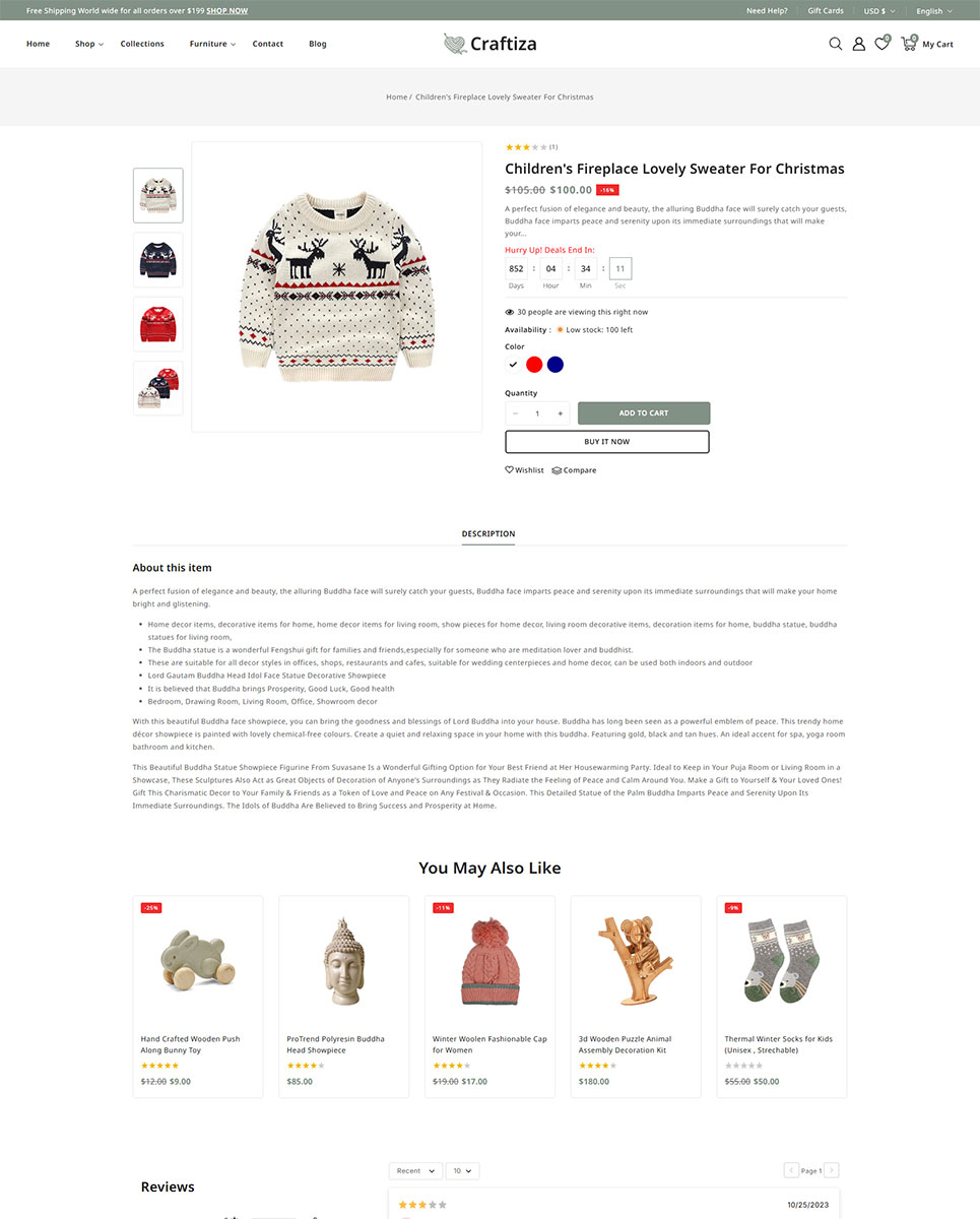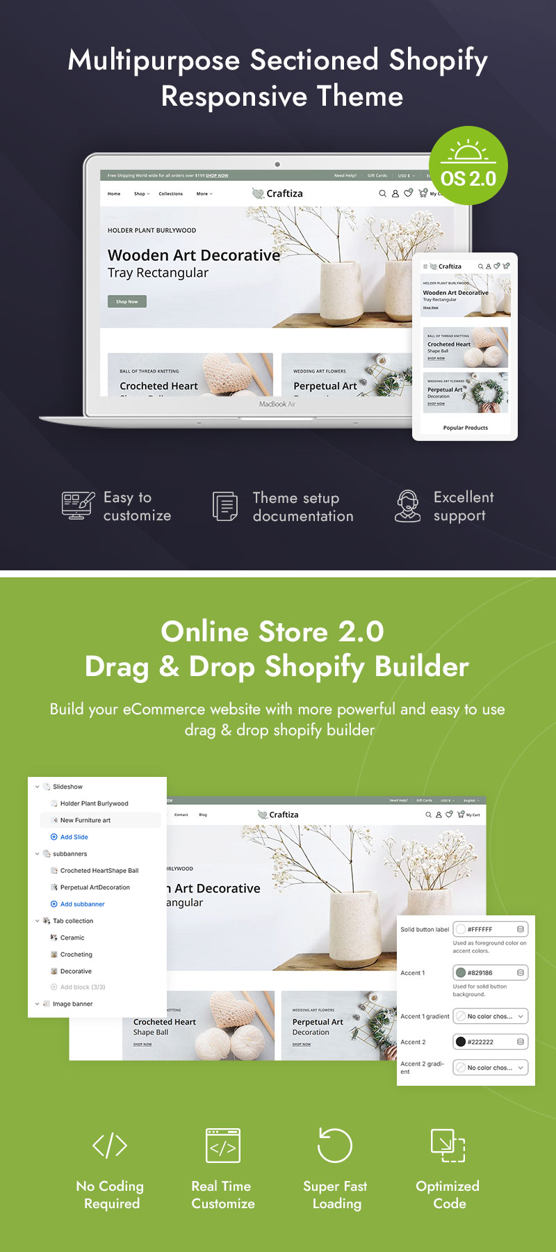 Built with the latest Shopify 2.0 architecture, Craftiza features an intuitive drag-and-drop builder that gives you full control over your store’s layout. No coding skills are required — simply use flexible sections and blocks to design unique pages that reflect your creative brand. The theme includes modern UX features such as AJAX-powered product filters, quick view, wishlist, compare functionality, and a smooth add-to-cart experience to streamline browsing and increase conversions.