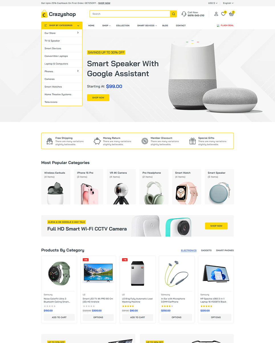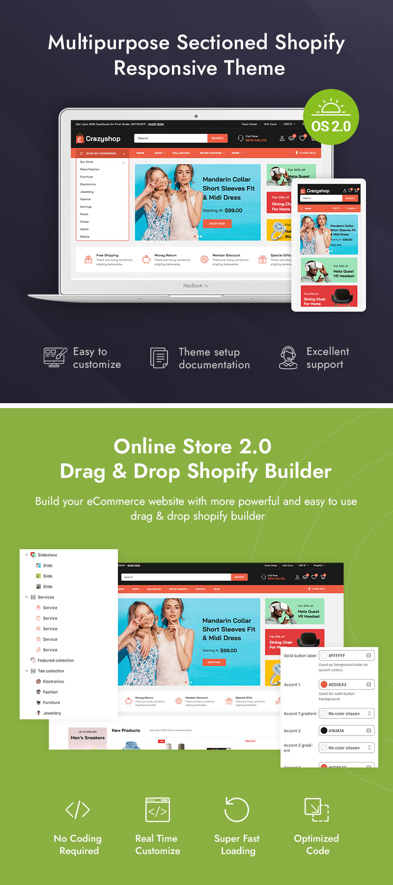 This theme comes with a versatile selection of pre-designed templates and layouts that cater to a wide range of industries. From clean and minimalist designs to vibrant and feature-rich layouts, Crazyshop offers endless possibilities for tailoring your online store. Built on the Shopify 2.0 framework, Crazyshop leverages the latest Shopify features, including enhanced speed, flexibility, and customizable sections on every page. The drag-and-drop functionality allows for easy design adjustments without the need for coding knowledge.