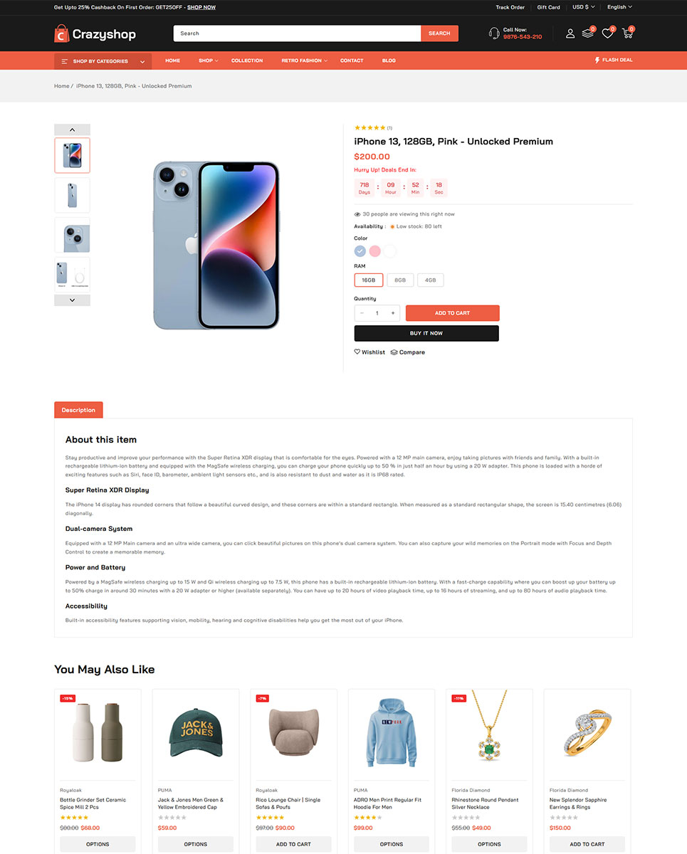 Enjoy complete control over your website’s look and feel with highly customizable sections. Change colors, fonts, banners, and product showcases with ease to match your brand identity. Showcase your products in the best light with advanced product pages that include zoom features, quick view options, size guides, and more. Crazyshop incorporates features like quick add-to-cart, wishlist, compare, advanced product filter, ajax search, multi-currency, and language adaptability to cater to a global audience, improving customer satisfaction and retention.