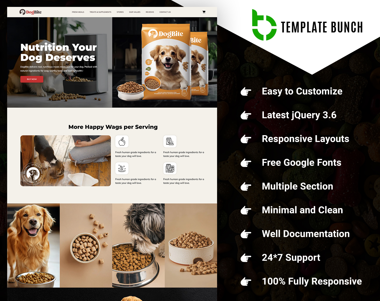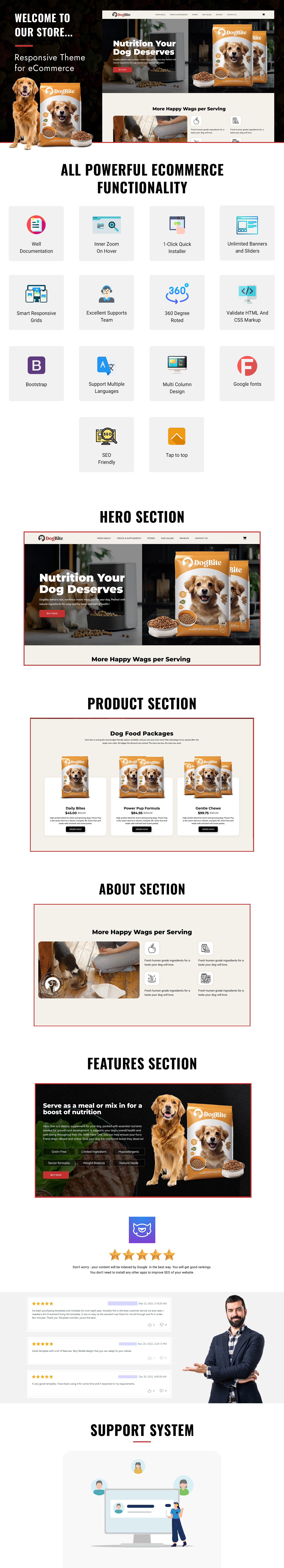Enjoy the benefits of free Google Fonts, a visually stunning layout, and a CSS3 table-less design that loads fast and looks professional. Plus, with round-the-clock support, you’ll never be alone on your eCommerce journey. Elevate your single-product store with Dog Bite—where performance meets style.