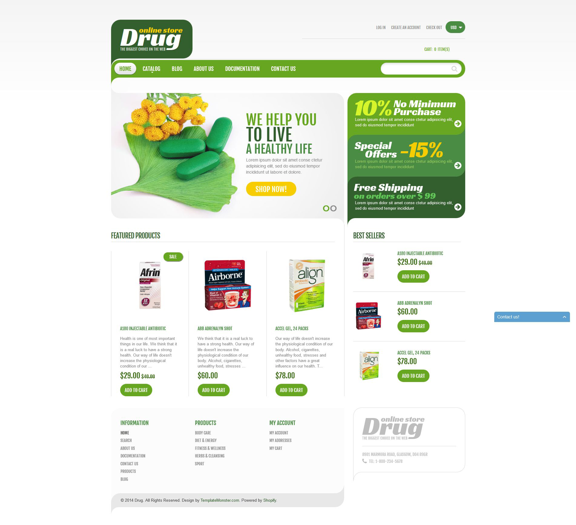 Websites connected with health and medical products should look clean, professional, yet cheerful in order to encourage the visitors. Our template is done in the right style. Enough white space makes it clean. UI elements of different green hues refresh the layout. Fonts and buttons are of rounded forms, which makes them friendlier. Featured medicines are displayed in slider, new products can be seen in the content area and special products are arranged in the right sidebar. Contacts and additional menu can be easily found in the footer. In a word, the template is a good option to consider for your medical store.