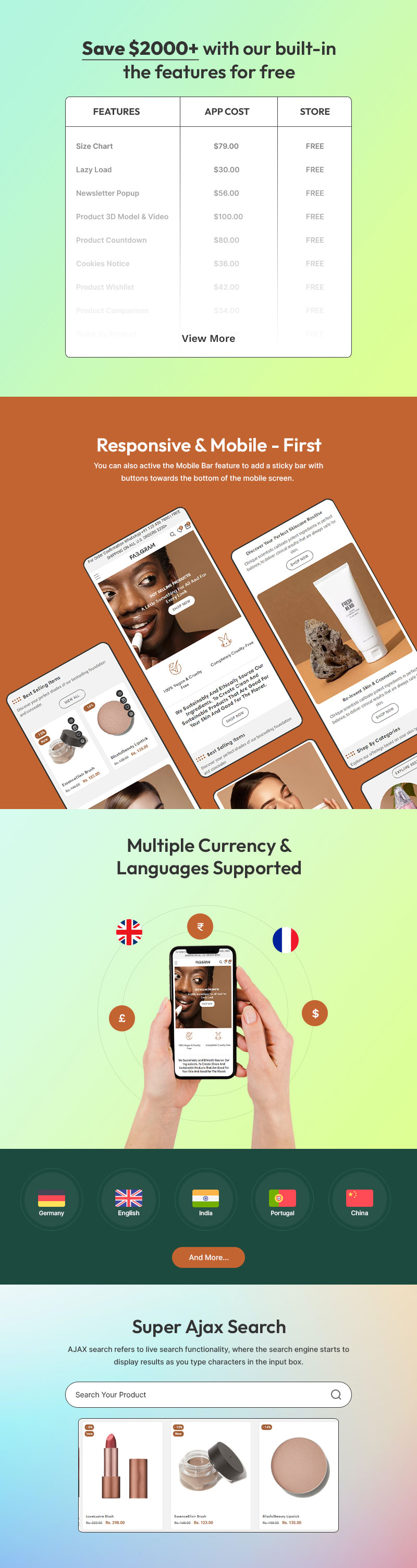 To help you increase sales and customer engagement, FabGram includes marketing tools like featured product sliders, promotional banners, countdown timers, and discount badges. Social media integration makes it effortless to connect with beauty influencers and customers on Instagram, TikTok, and Pinterest, helping you showcase new arrivals, beauty trends, and tutorials. Plus, with multi-currency and multi-language support, you can sell your products globally with ease.