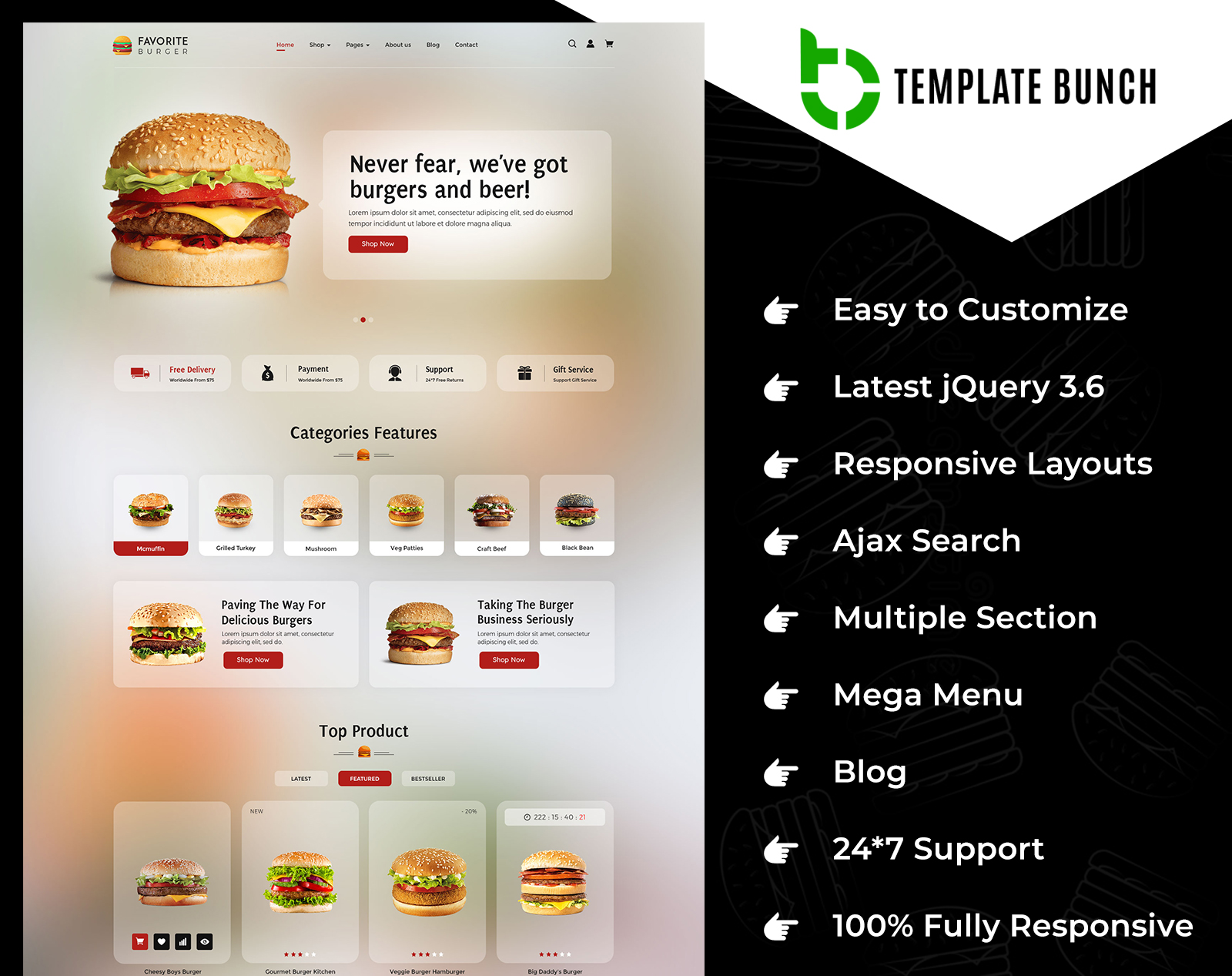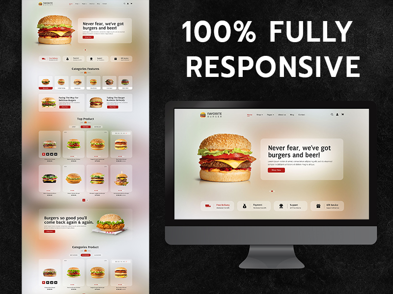 Built on Bootstrap and equipped with a live customizer and Redux framework, Favorite Burger offers unlimited options to help you craft a store that aligns perfectly with your brand. The one-click import feature ensures a quick and seamless setup, while the 100% responsive layout ensures your site looks amazing on all devices.