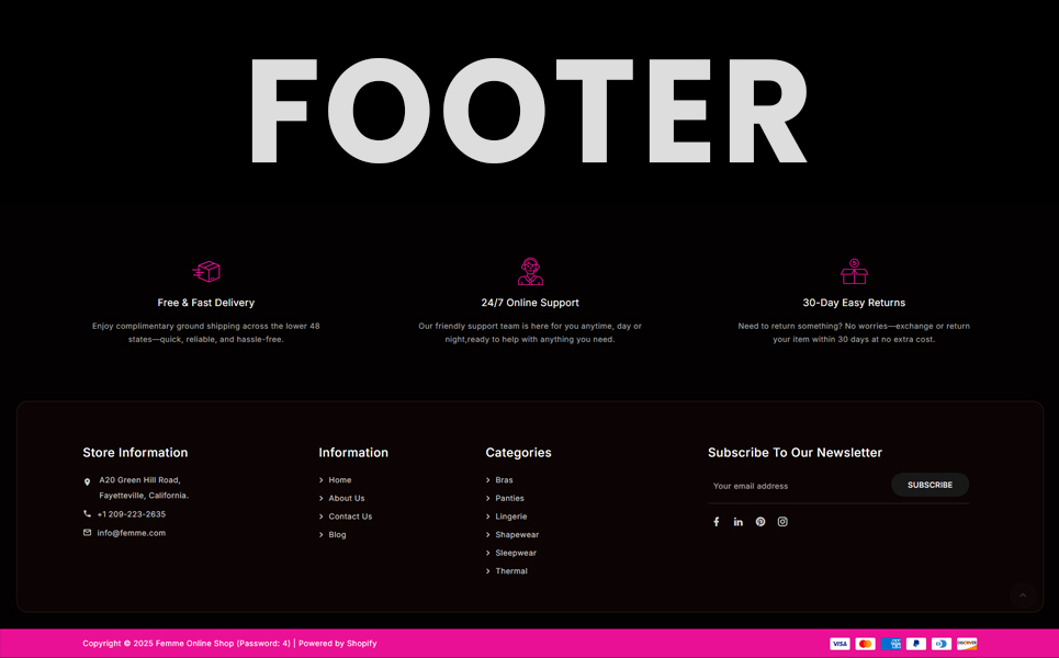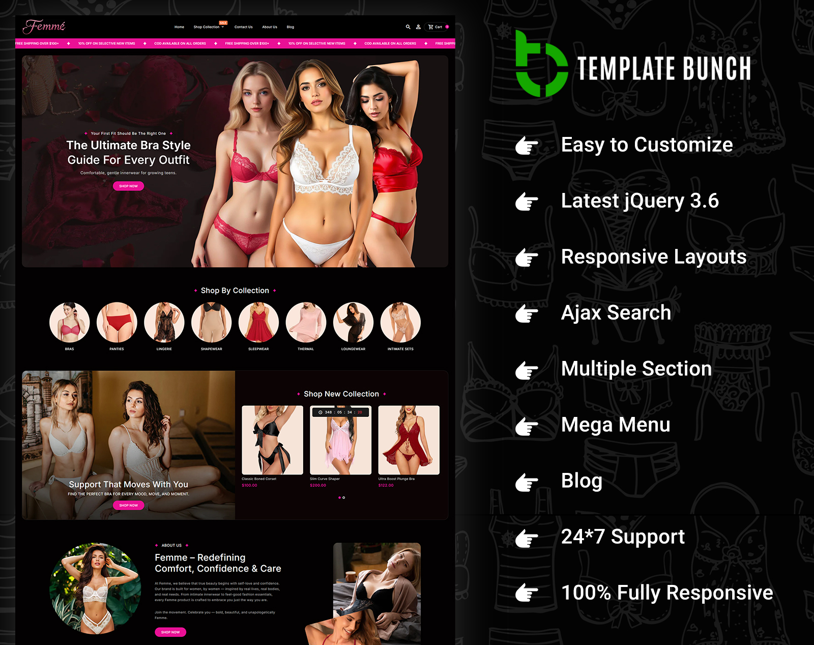 Stay up-to-date with free theme updates, enjoy cross-browser compatibility, and rely on 24/7 support to keep your store running smoothly. Whether you're selling nightwear, sleepwear, or intimate fashion, Femme Night Wear offers a beautiful and professional online presence that inspires confidence and trust.