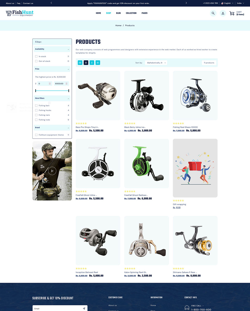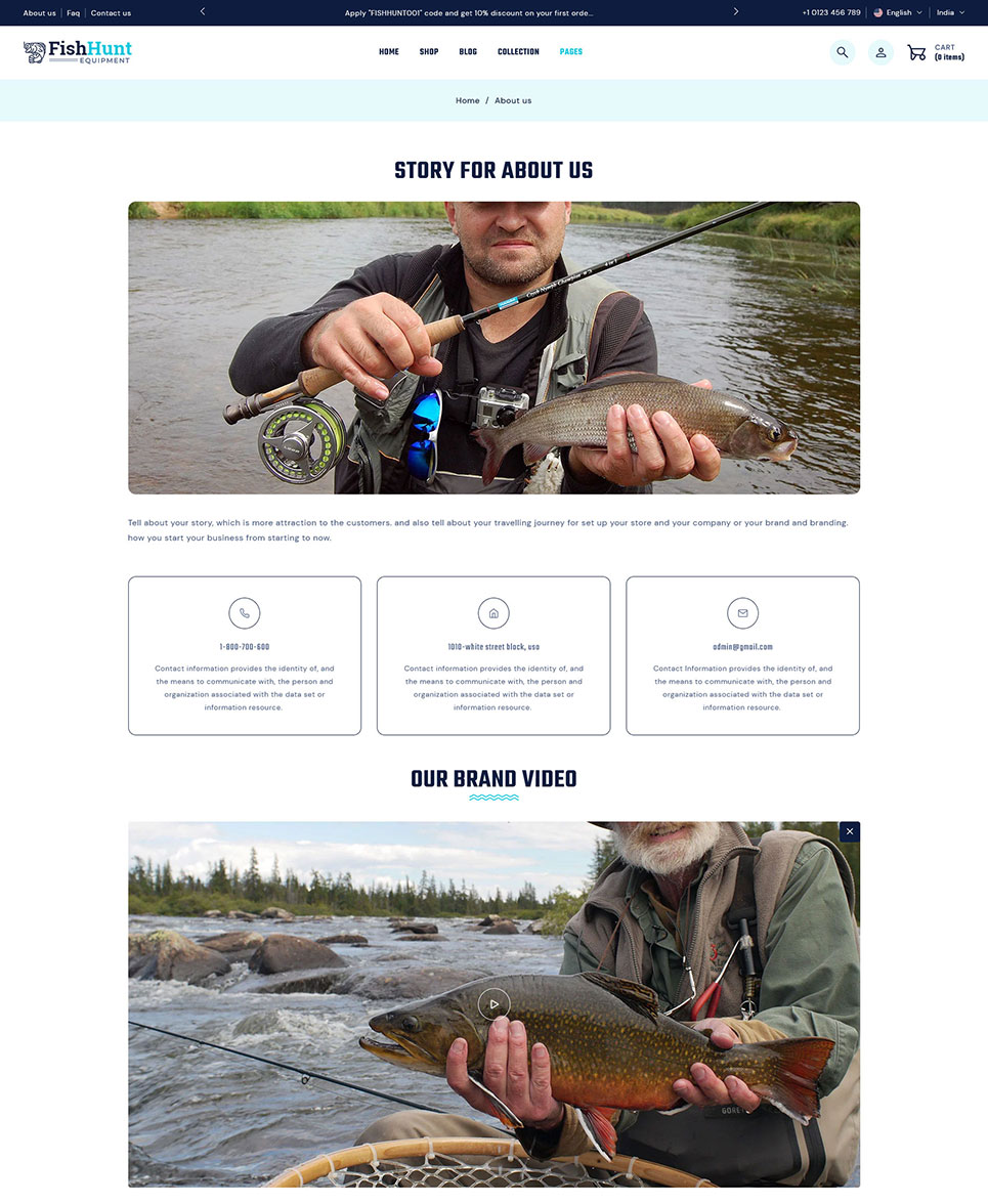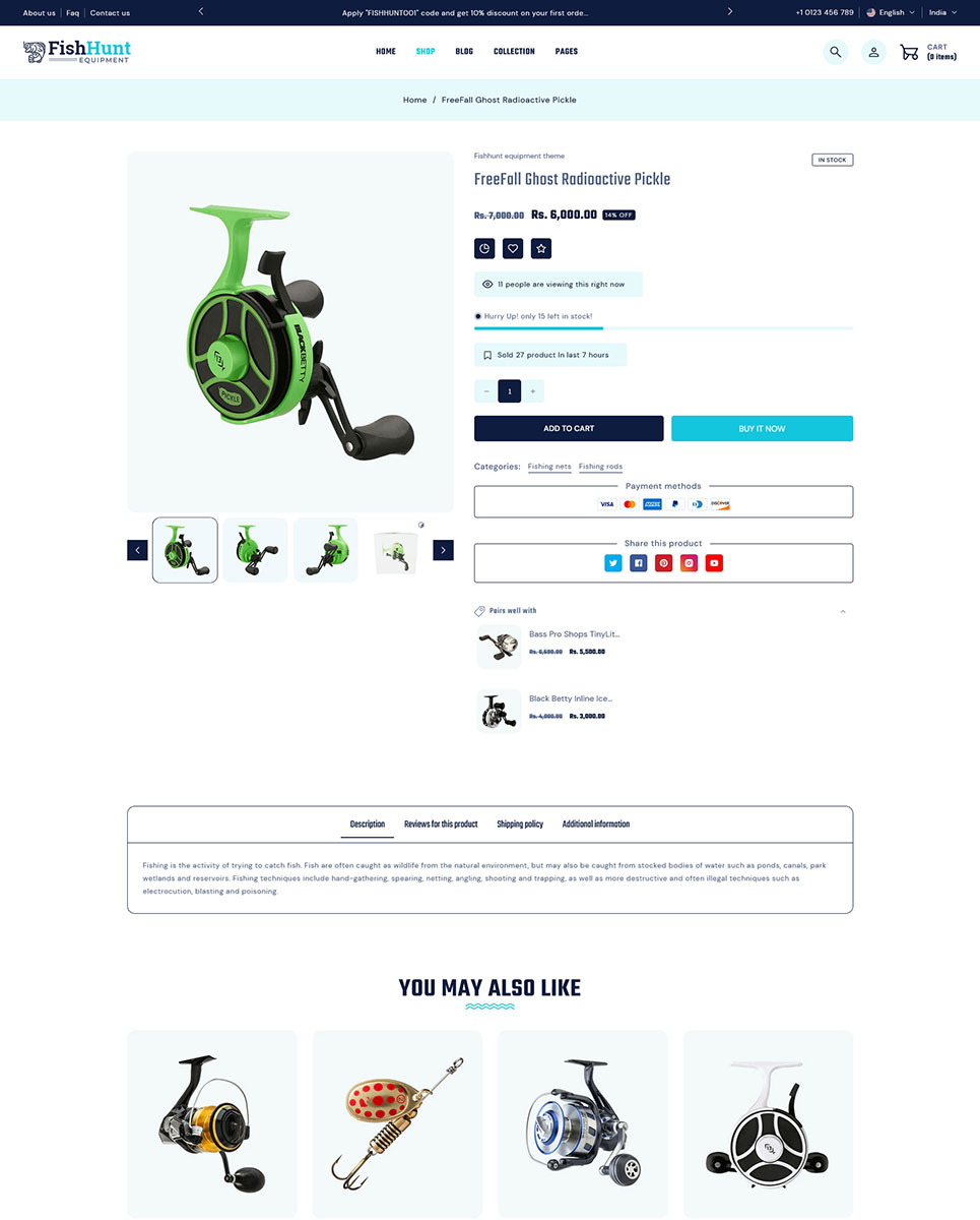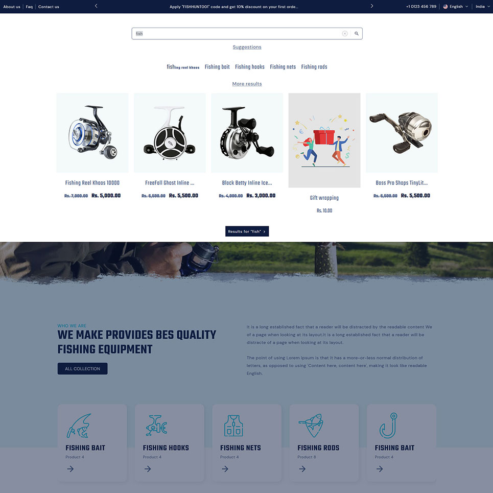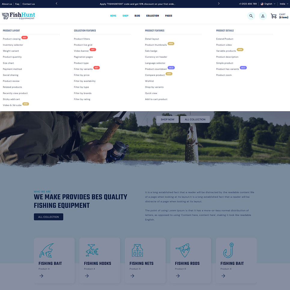 Specifically designed for stores selling fishing, hunting, and outdoor equipment, FishHunt’s aesthetic and functionalities cater to the unique needs of these niches. Whether you’re selling fishing rods, tackle boxes, hunting rifles, or camping gear, FishHunt provides the perfect backdrop to showcase your merchandise, emphasizing the rugged and adventurous nature of your products.