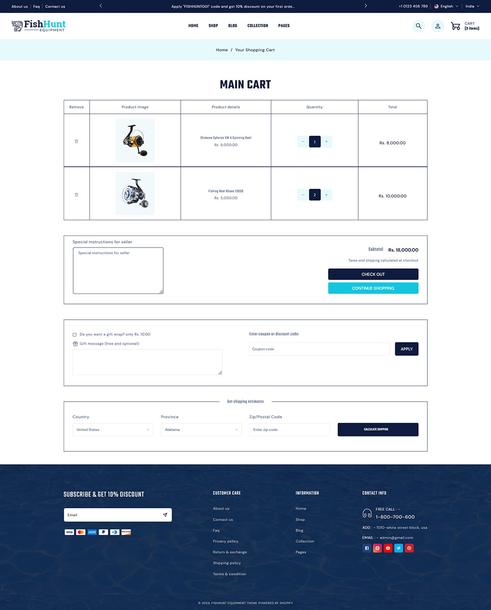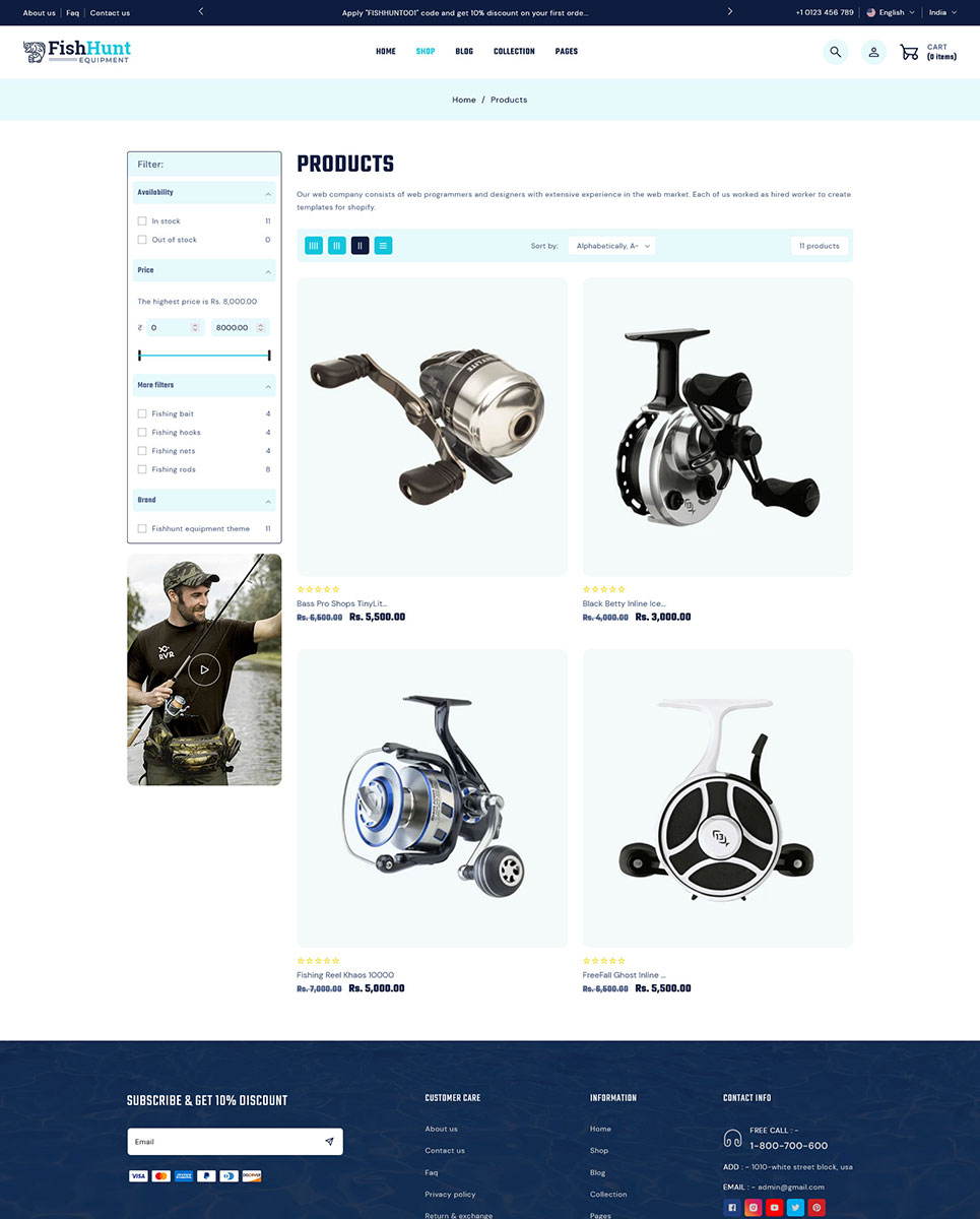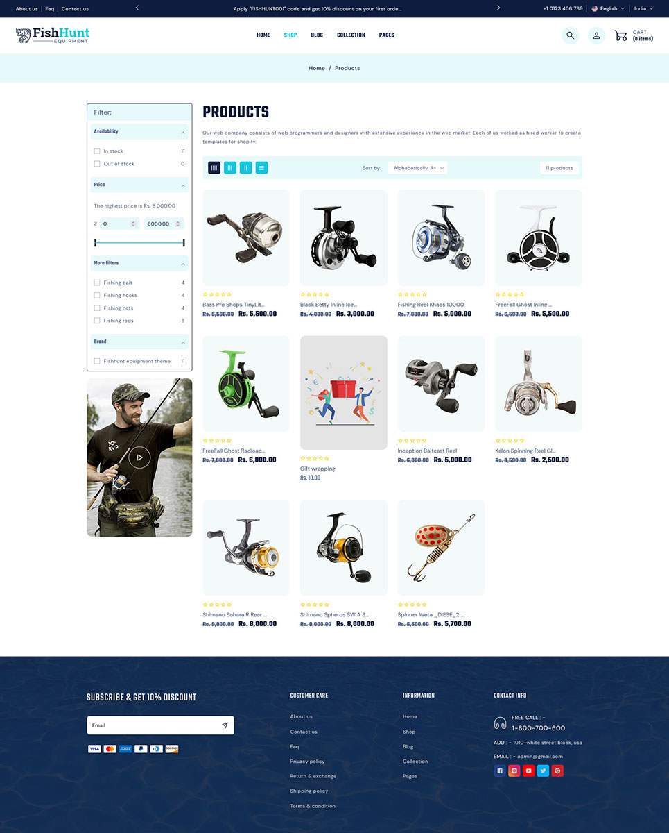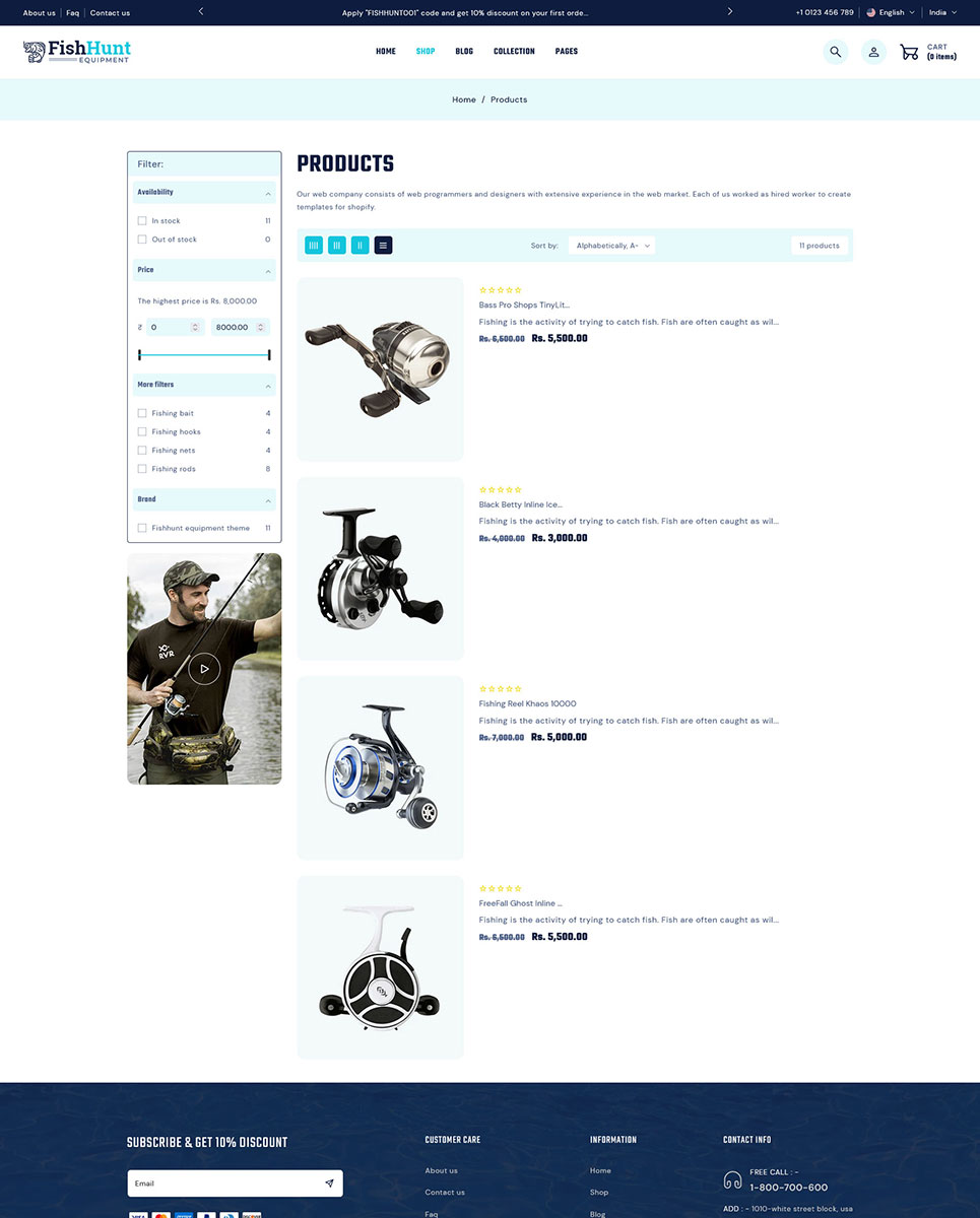 Specifically designed for stores selling fishing, hunting, and outdoor equipment, FishHunt’s aesthetic and functionalities cater to the unique needs of these niches. Whether you’re selling fishing rods, tackle boxes, hunting rifles, or camping gear, FishHunt provides the perfect backdrop to showcase your merchandise, emphasizing the rugged and adventurous nature of your products.