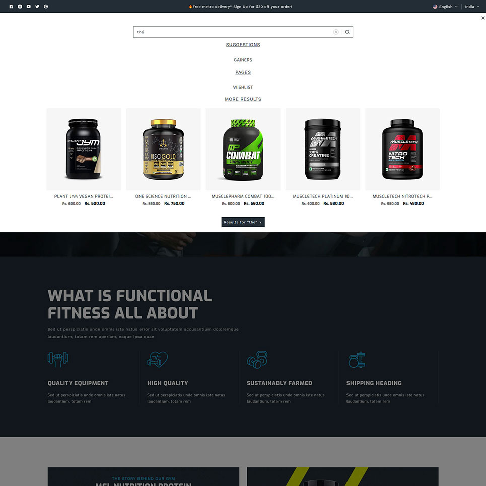User-friendly navigation is a key focus of Fitworld, with an intuitive menu and easy-to-use search functionality designed to help customers find products quickly and efficiently. The theme also includes customizable headers and footers, allowing you to align your store’s appearance with your brand’s aesthetic.