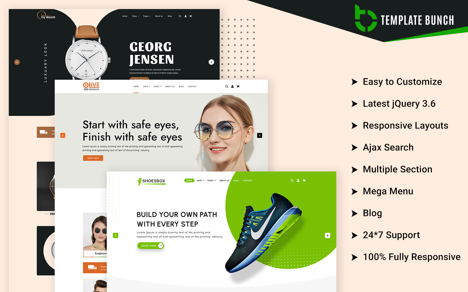 Fly - Watch and Goggles with Shoes - Responsive Shopify Theme for eCommerce. Our e-commerce template is built on Bootstrap, ensuring that your store is 100% responsive and displays perfectly on all devices. The template features a working contact form with Ajax integration, making it easy for customers to get in touch with you. Customizing your store is a breeze with our template, thanks to its easy-to-use interface and well-commented files. The design is minimal and clean, putting the focus on your products and enhancing the overall shopping experience. We've used material icons and free Google Fonts to give your store an awesome and unique look. Plus, all files are well-commented, making it easy for you to understand and modify the template to suit your needs. Upgrade your online store today with our feature-packed e-commerce template!