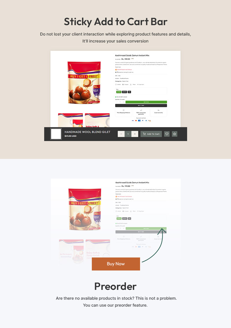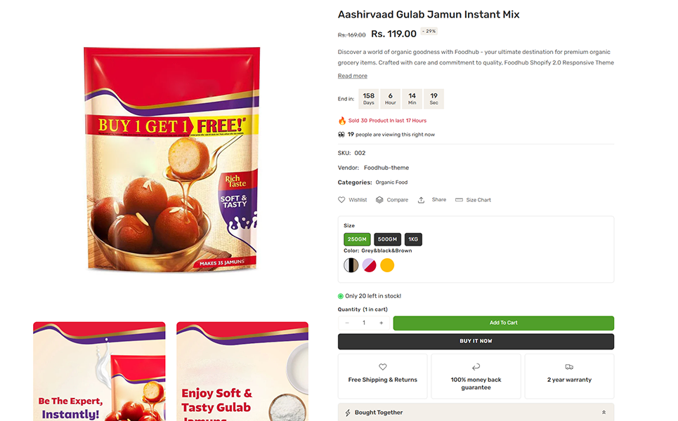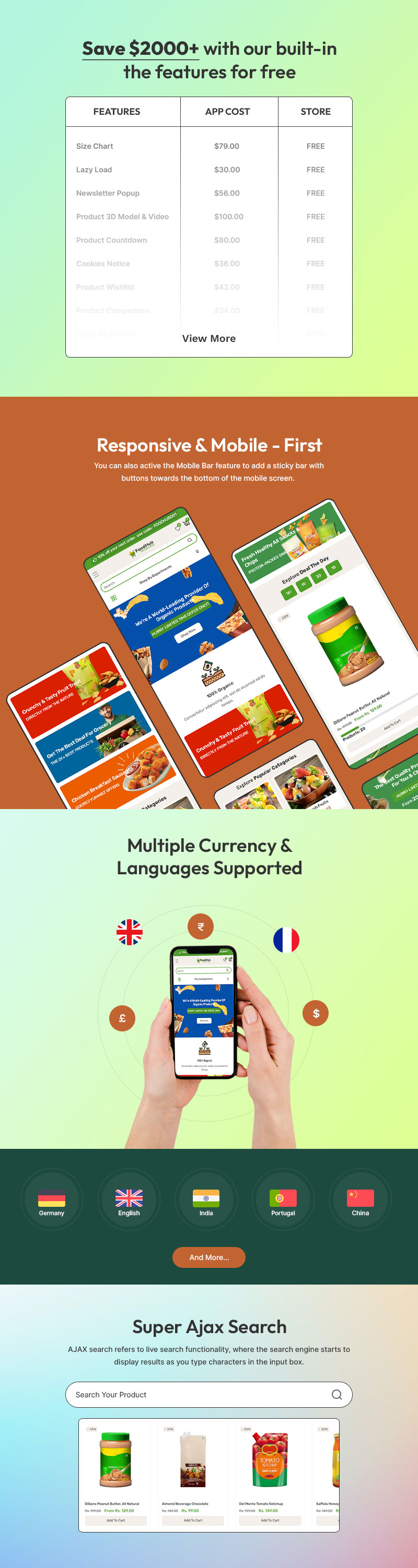 Customization is easy with FoodHub’s drag-and-drop editor, allowing you to personalize colors, fonts, and layouts to align with your brand’s identity. The smart filtering and search system lets shoppers quickly browse by category, dietary preferences, bestsellers, and new arrivals, ensuring a smooth shopping journey. Each product page is designed to increase engagement and conversions, featuring ingredient details, nutritional information, high-resolution images, and customer reviews.