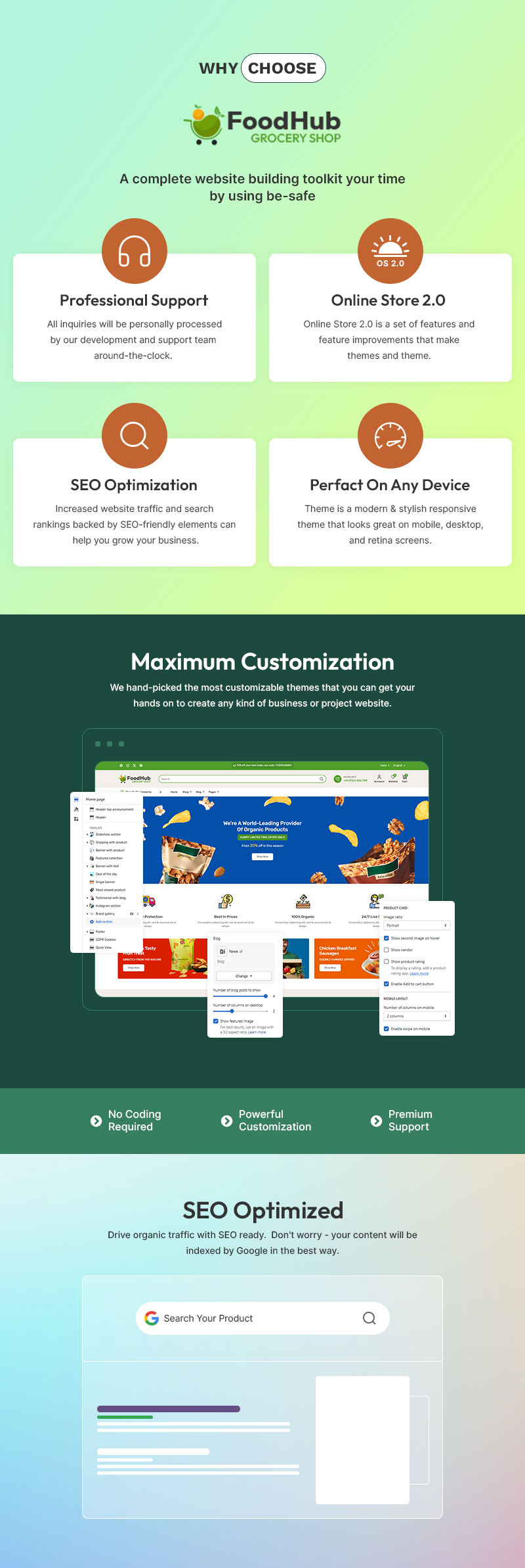Perfect for supermarkets, organic food brands, and specialty grocery retailers, FoodHub blends functionality, high-end design, and an intuitive user experience to create a high-performing online grocery store.