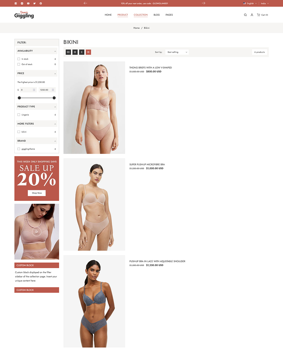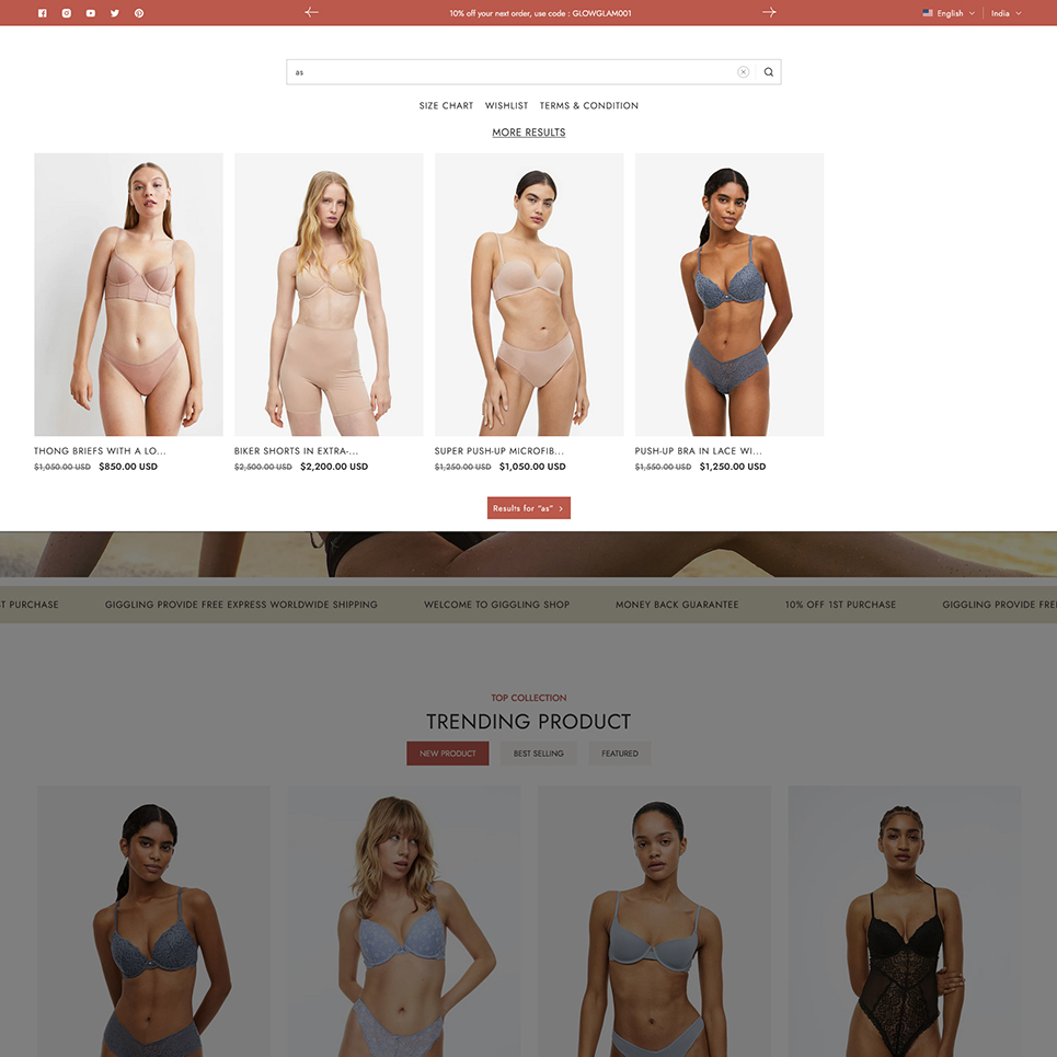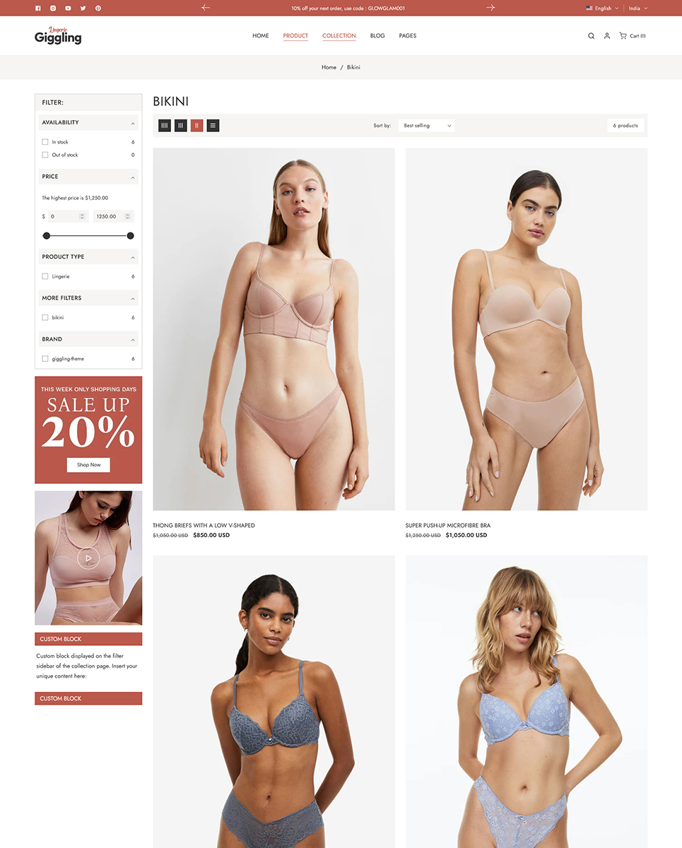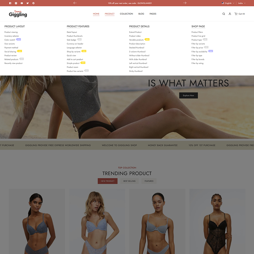 Discover Giggling, the ultimate Shopify 2.0 theme designed for lingerie, bikini, and innerwear fashion stores. Elevate your online presence with Giggling’s perfect blend of aesthetic appeal and powerful functionality, ensuring your intimate fashion products shine on every screen.