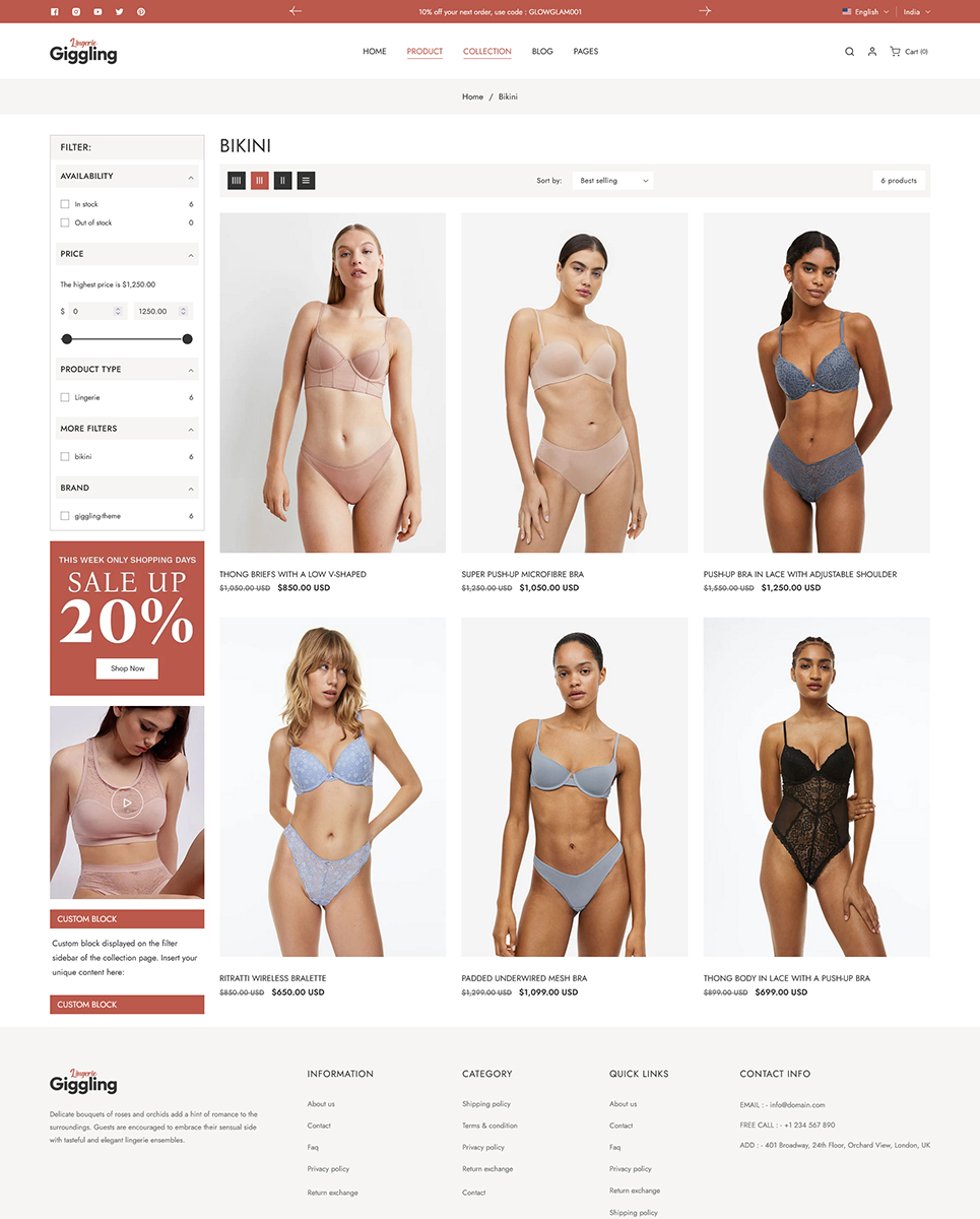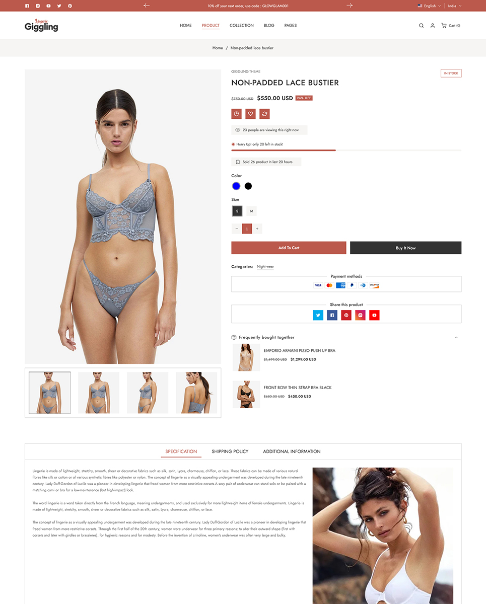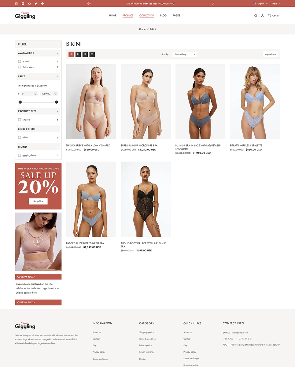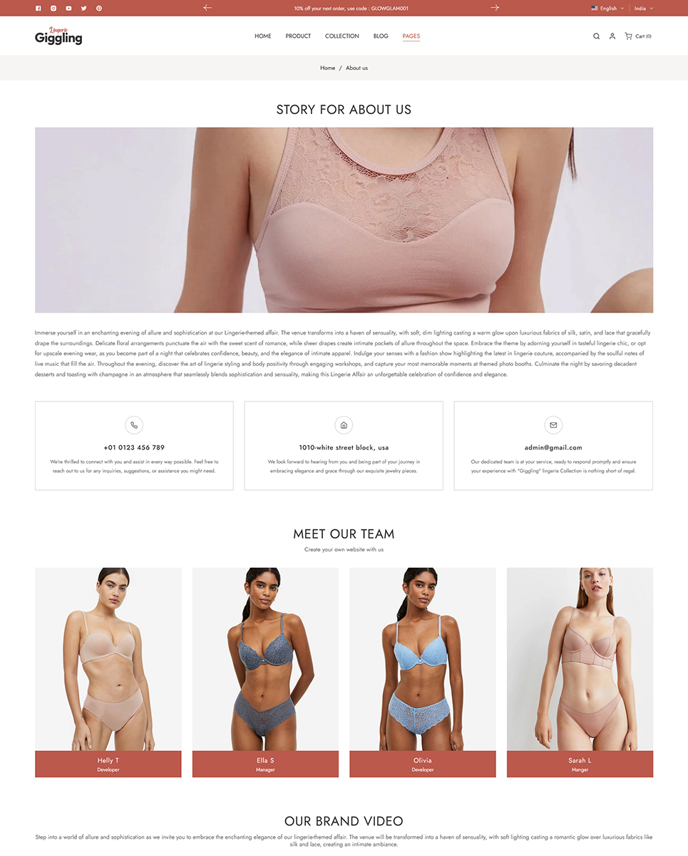 Discover Giggling, the ultimate Shopify 2.0 theme designed for lingerie, bikini, and innerwear fashion stores. Elevate your online presence with Giggling’s perfect blend of aesthetic appeal and powerful functionality, ensuring your intimate fashion products shine on every screen.