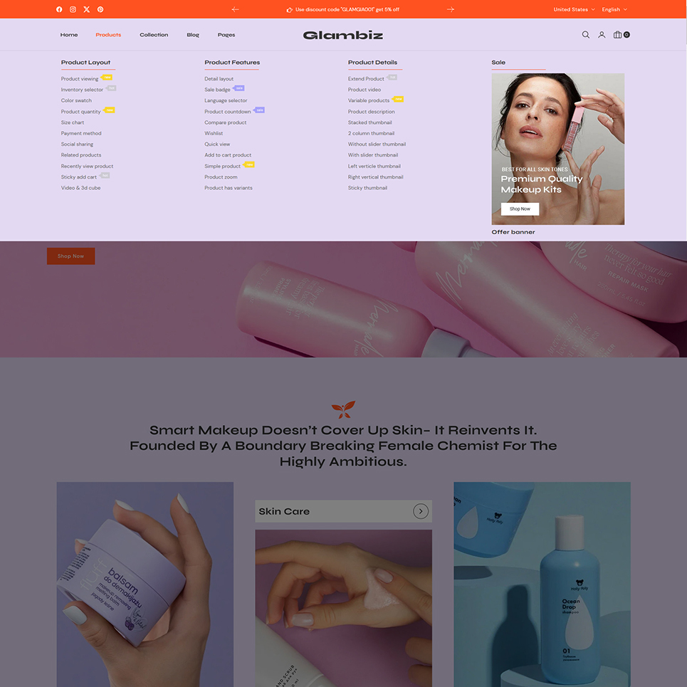 Discover Glambiz, the ultimate Shopify 2.0 theme designed exclusively for beauty, cosmetics, and skincare stores. Elevate your online presence with Glambiz’s seamless blend of aesthetic elegance and robust functionality, tailored to ensure your beauty products shine on every screen.