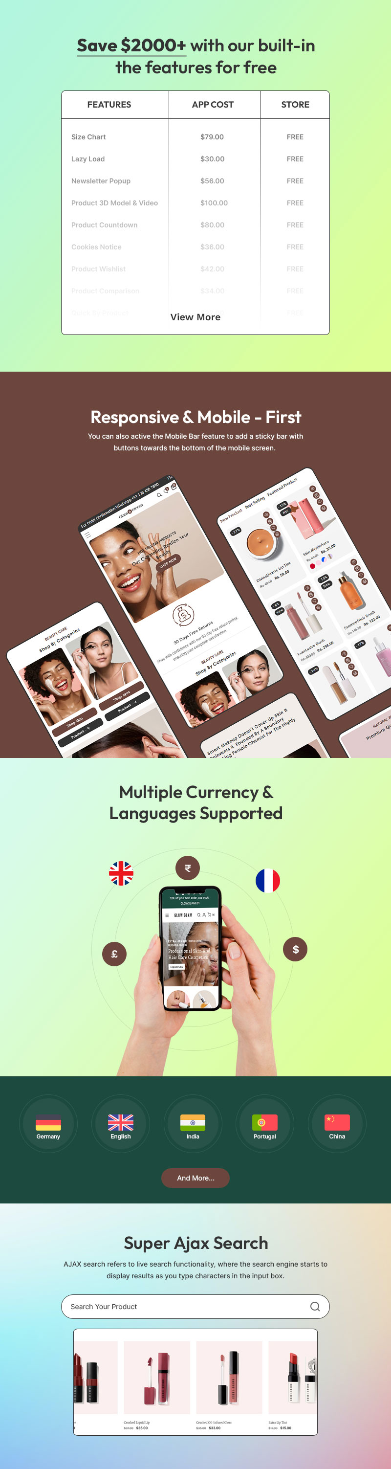 To boost sales and brand awareness, GlamBloom includes powerful marketing features such as special promotions, featured product badges, limited-time offers, and influencer collaborations. Social media integration makes it easy to showcase makeup tutorials, skincare routines, and customer testimonials on Instagram, TikTok, and YouTube, increasing engagement and conversions. With multi-currency and multi-language support, you can cater to a global audience effortlessly.