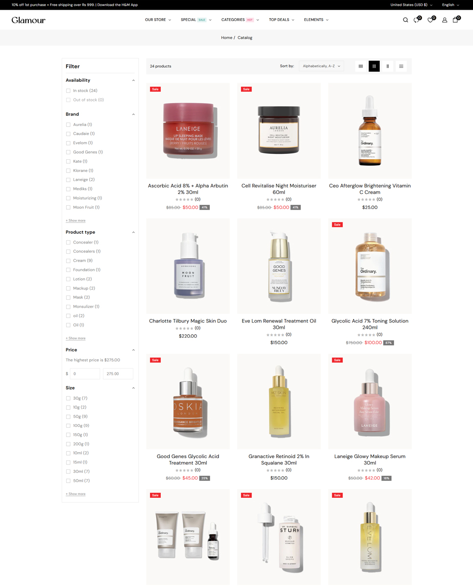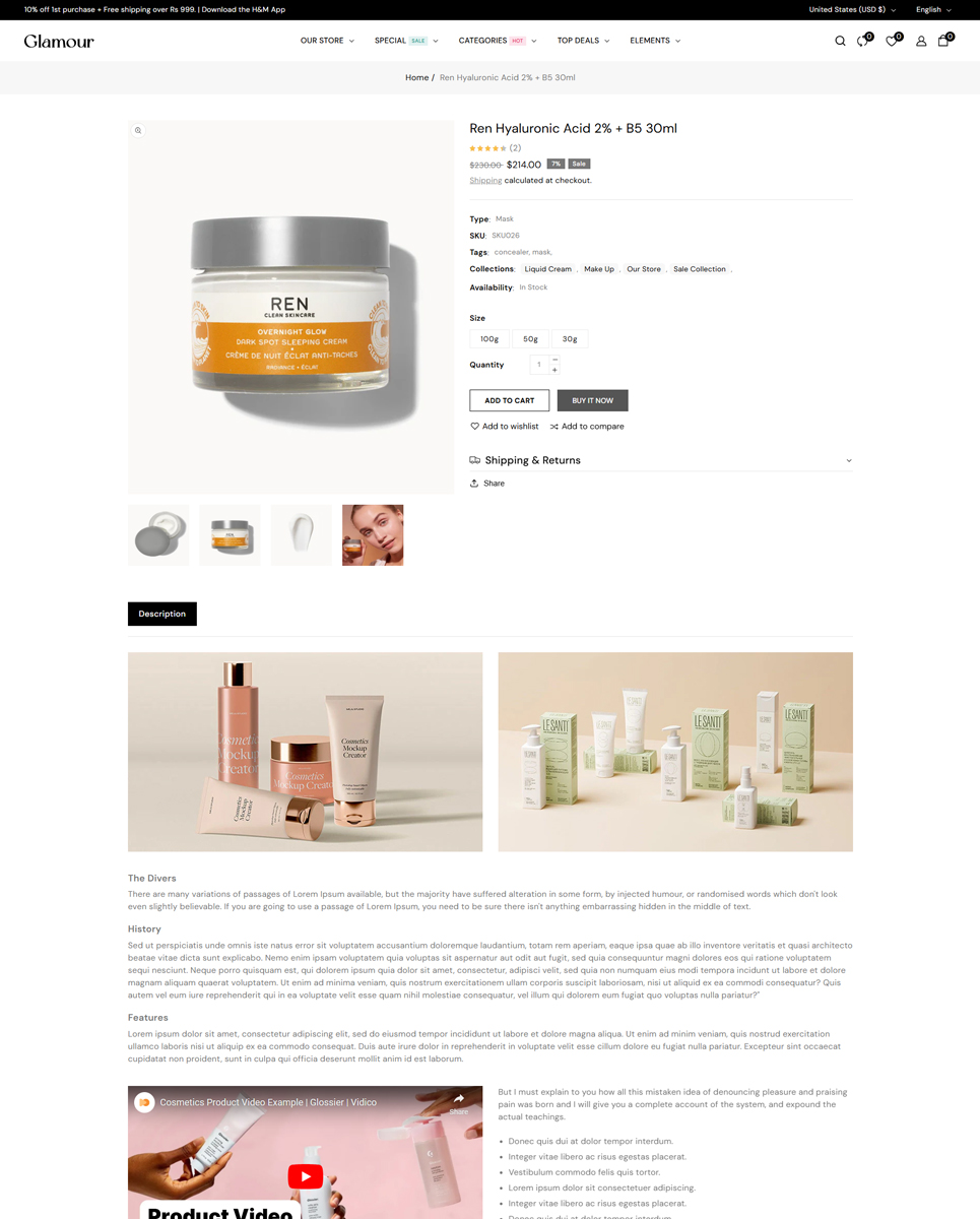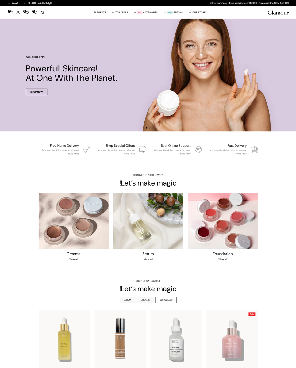 Introducing Glamour, a stunning, feature-rich Shopify theme designed for modern beauty brands, skincare boutiques, and fashion-forward stores. Whether you run a hair clinic, beauty salon, cosmetics shop, fashion store, or jewelry boutique, Glamour offers the perfect blend of aesthetics and functionality to elevate your online business.