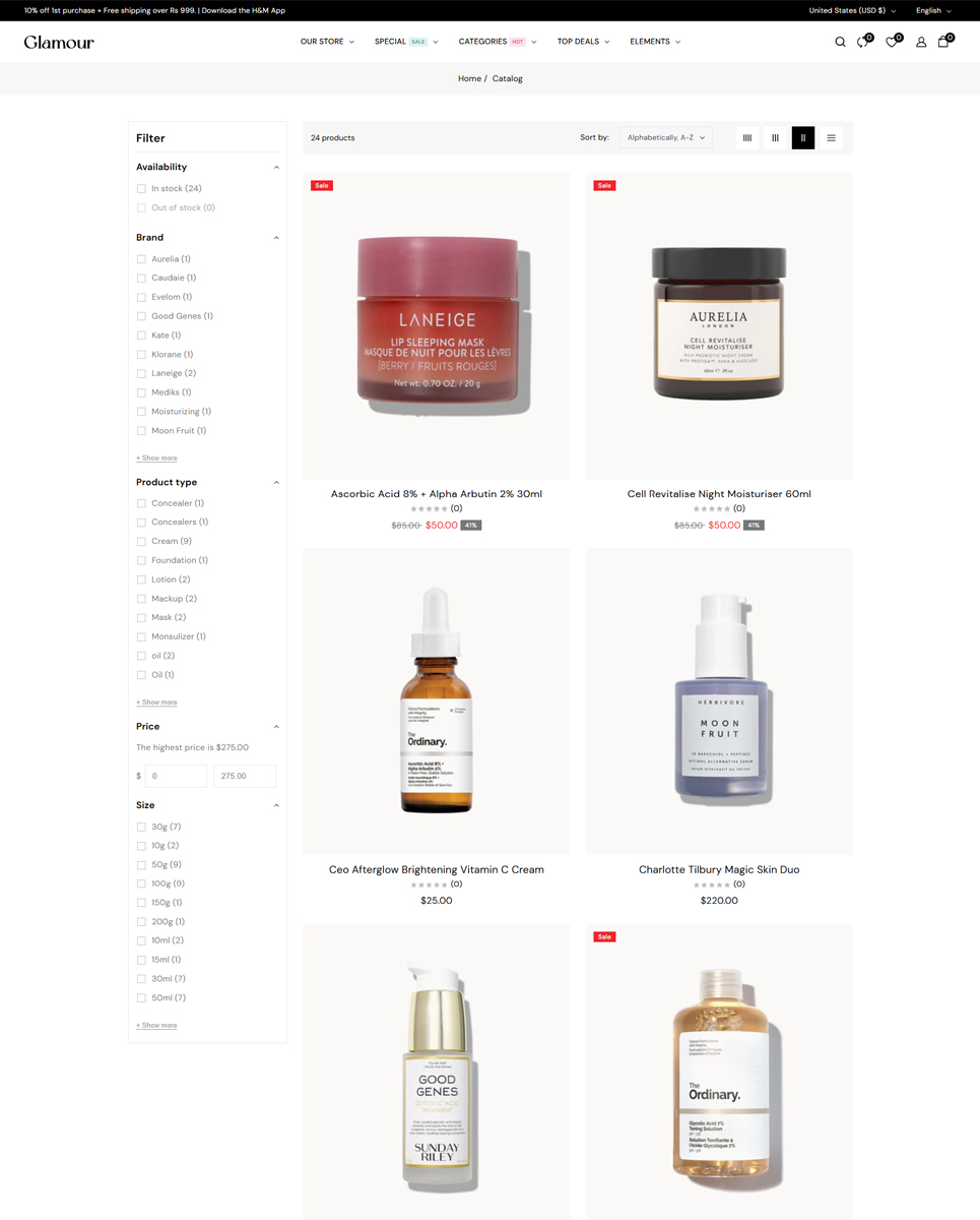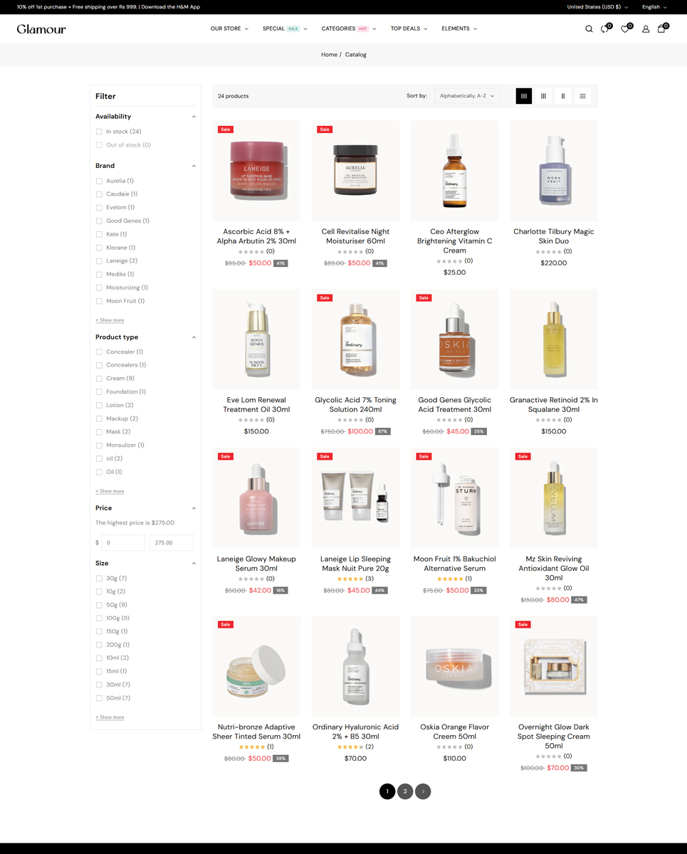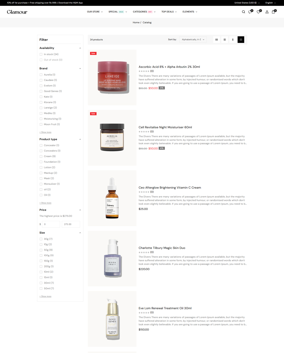 Introducing Glamour, a stunning, feature-rich Shopify theme designed for modern beauty brands, skincare boutiques, and fashion-forward stores. Whether you run a hair clinic, beauty salon, cosmetics shop, fashion store, or jewelry boutique, Glamour offers the perfect blend of aesthetics and functionality to elevate your online business.