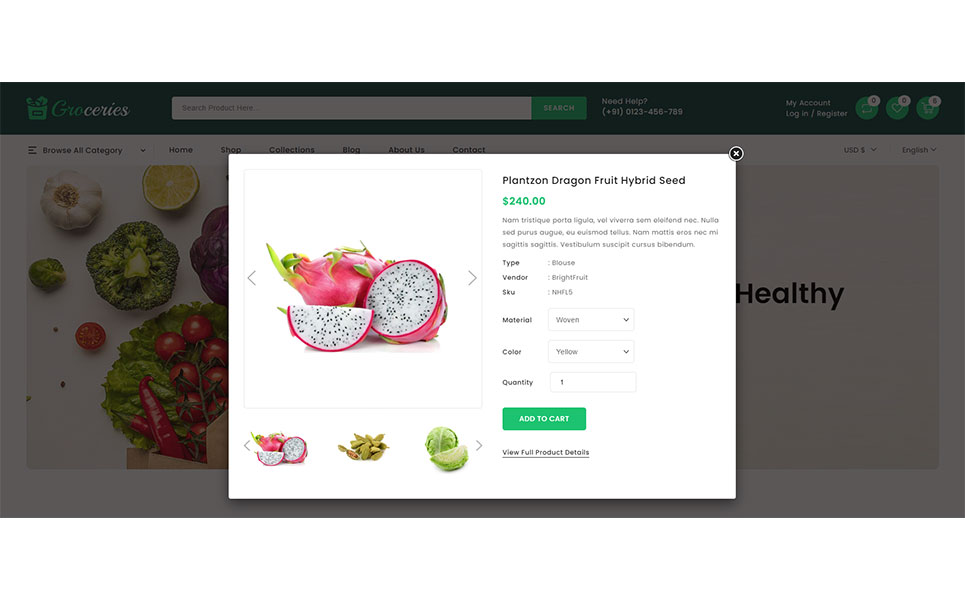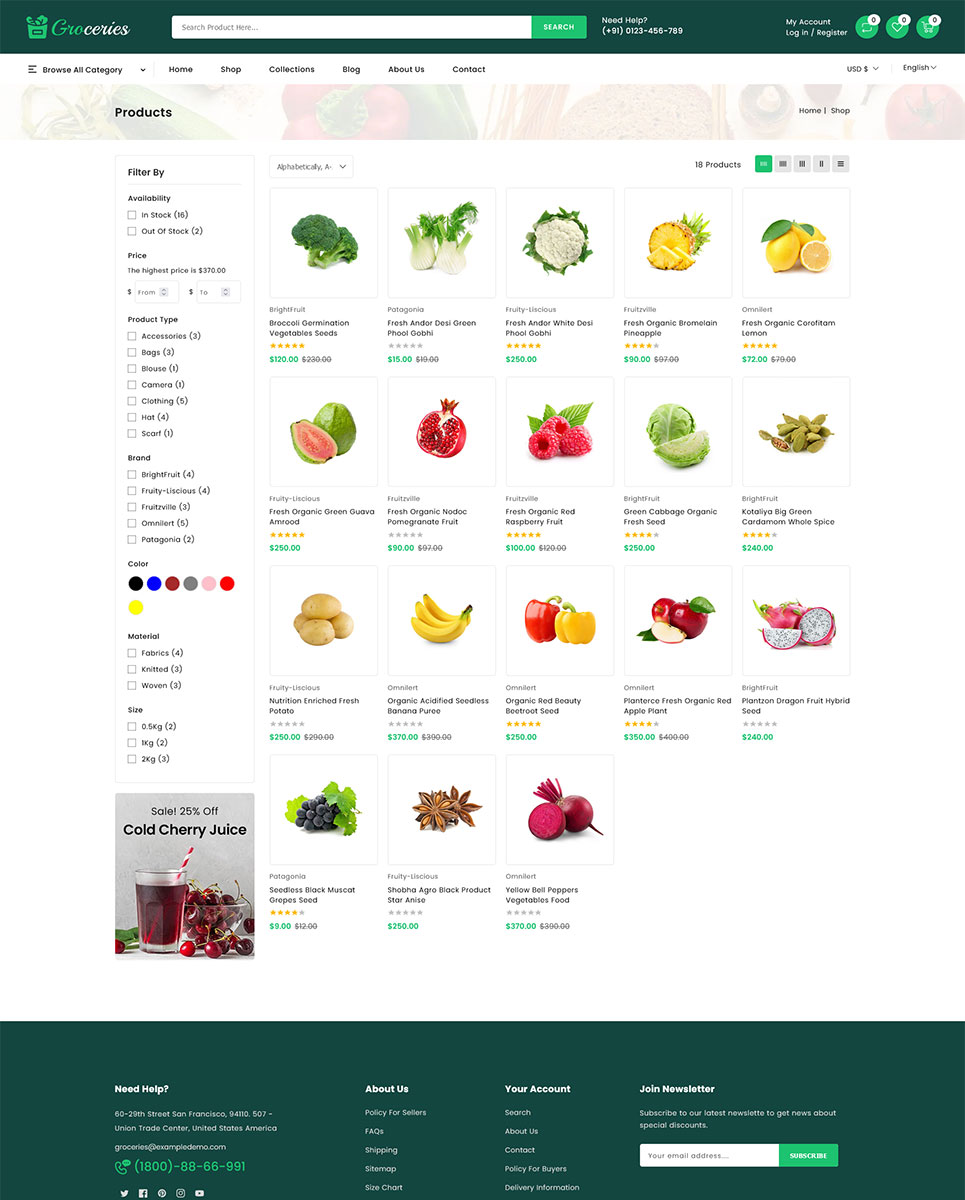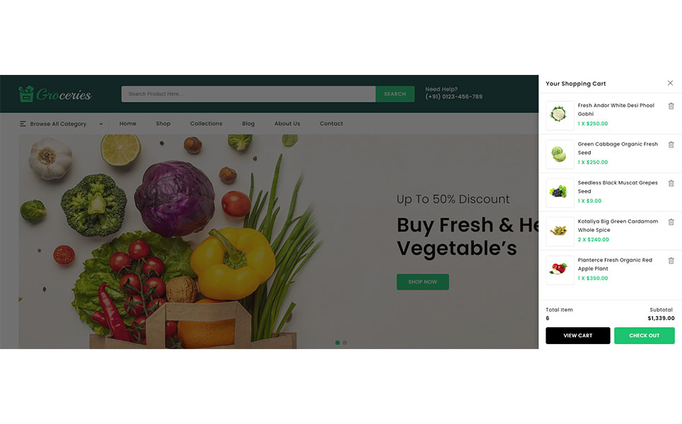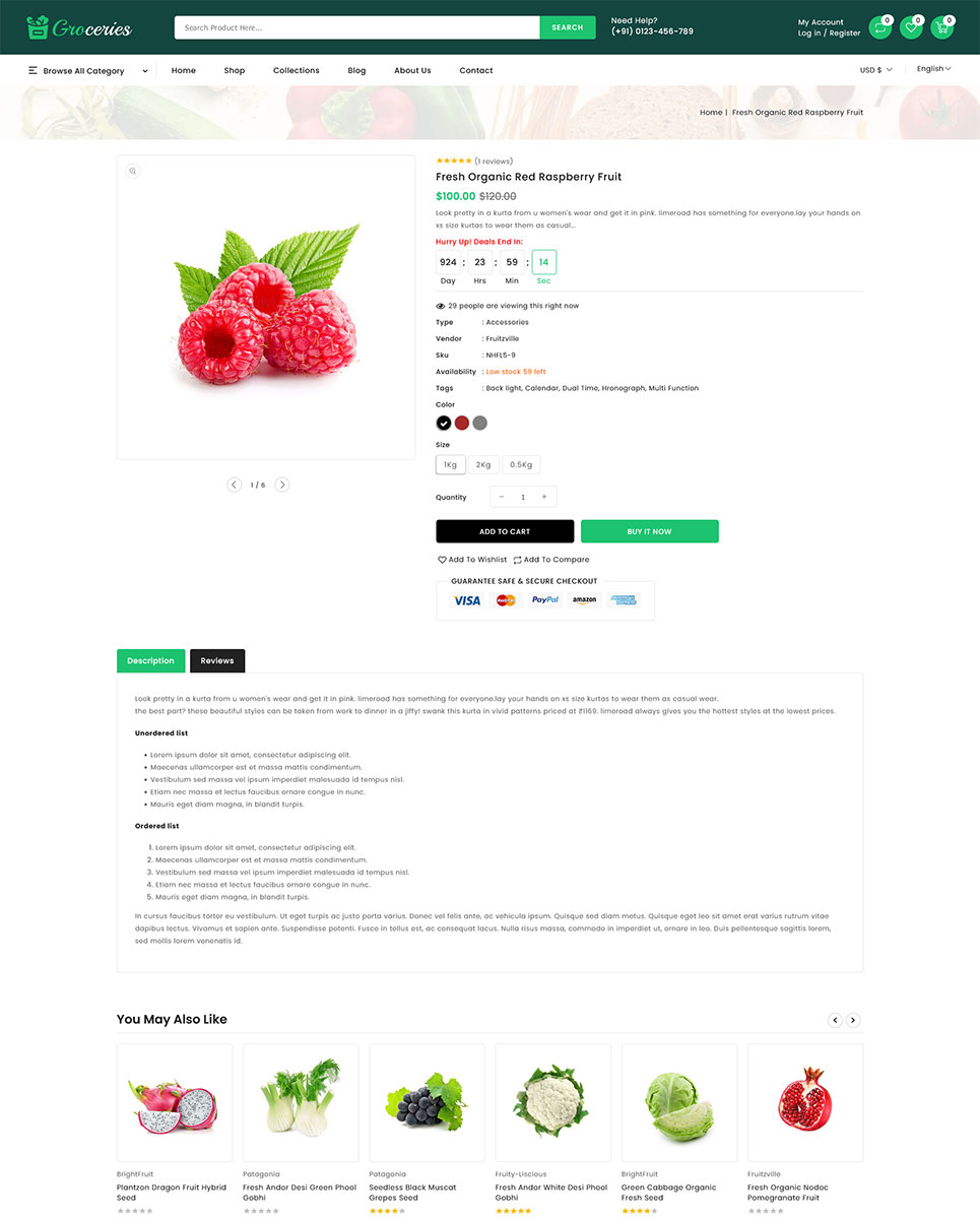 Groceries - Super Market Shopify theme we have designed for a variety of grocery products, such as fruits, vegetables, organic food, spices, bakery items etc. Excellent features of the theme include Mobile Layout, Shop by Category, Live Product Search, Product Zoom, Buy Now Button, Count Down Timer, Product Comparison, Advance Filter, Sticky Header etc. Without any coding experience, you can virtually manage every aspect of the theme's features and further customize your shop with the help of the versatile admin panel.