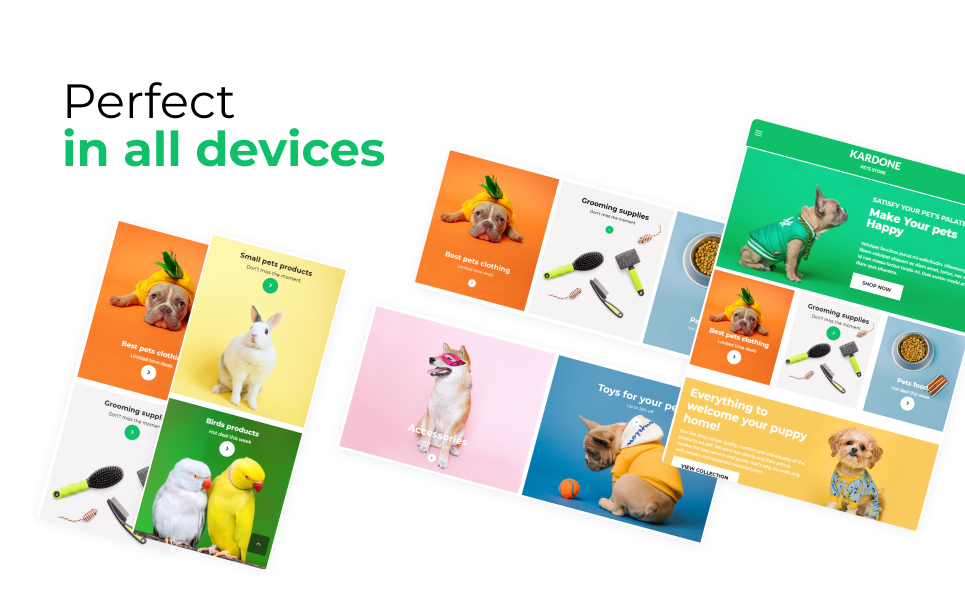 So, starting your own online store, do focus on its mobile-friendly design and powerful SEO. Luckily, the KarDone Pets Store Shopify Theme is fully responsive and retina-ready. This means with it, your site will perform the same good on any screen. And, your clients will enjoy buying and booking products and services for pets from any device they prefer.