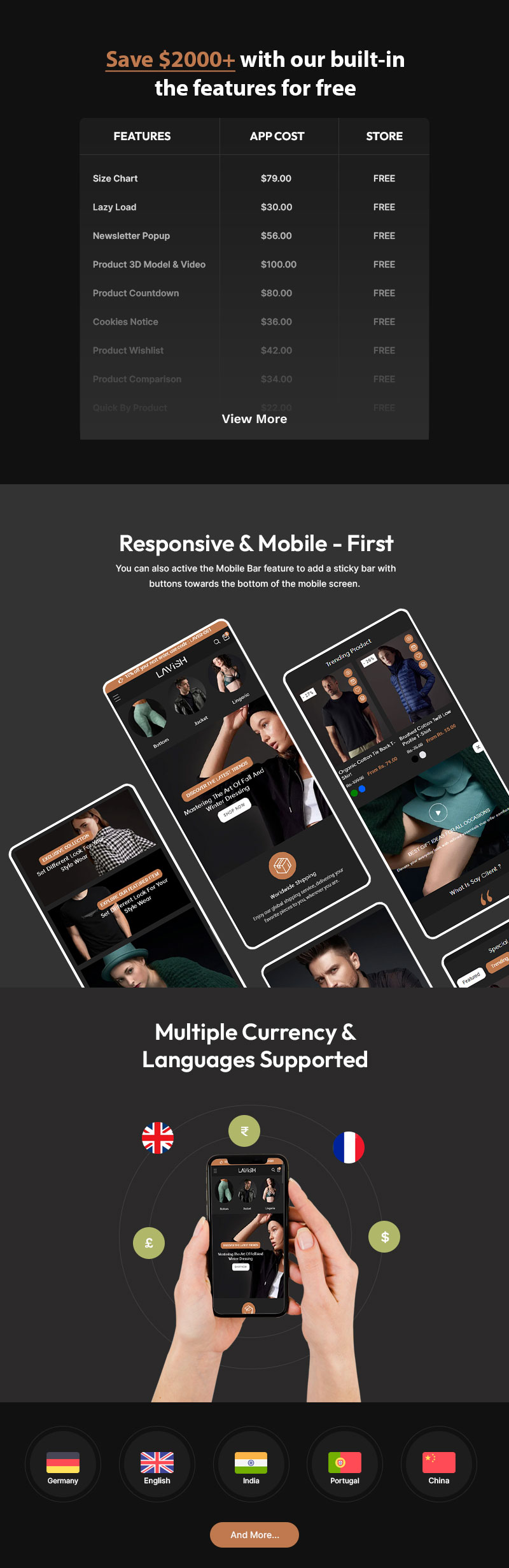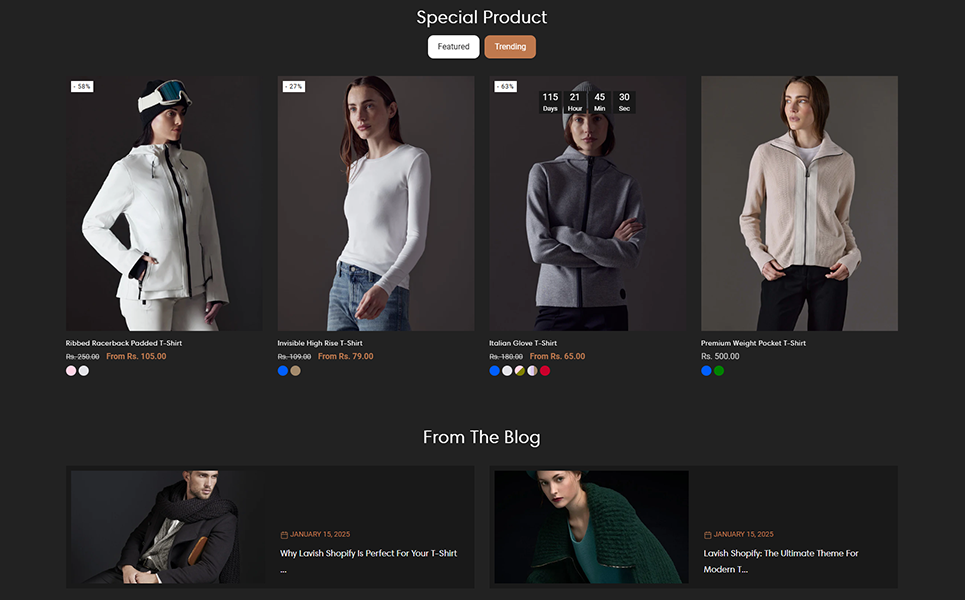 To boost visibility and sales, Lavish includes powerful marketing tools such as flash sales, discount countdowns, featured collections, and influencer promotions. Social media integration makes it easy to showcase fashion trends, styling videos, and customer looks on Instagram, TikTok, and Pinterest, driving traffic and engagement. With multi-currency and multi-language support, you can expand your brand’s reach and cater to a global audience effortlessly.