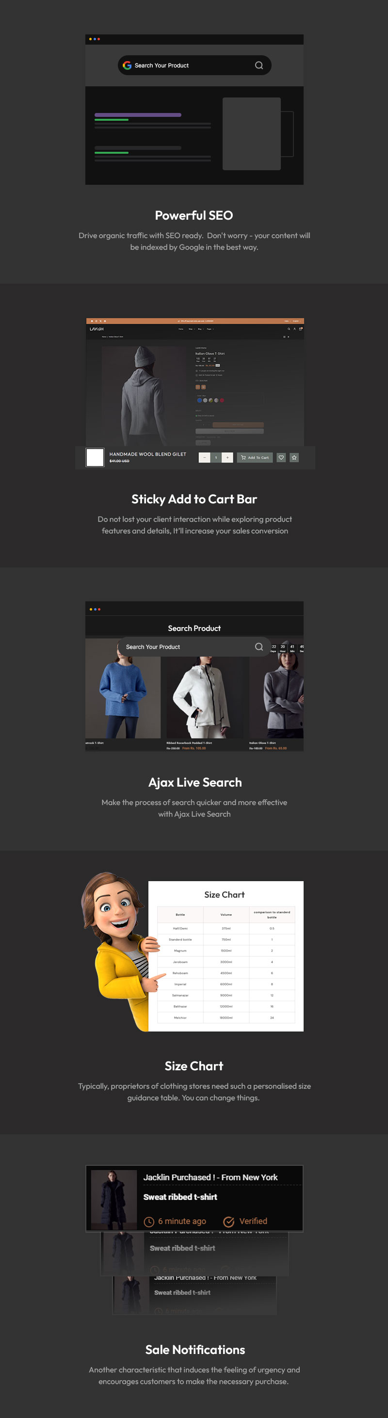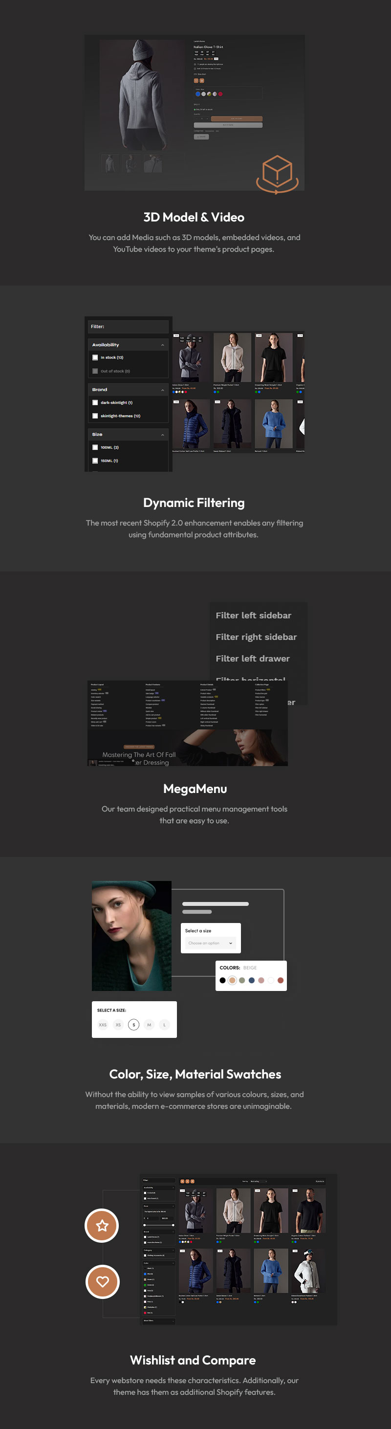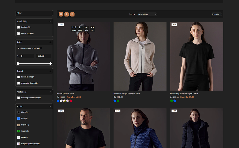 Customization is effortless with Lavish’s intuitive drag-and-drop builder, allowing you to adjust colors, fonts, and layouts to match your brand’s unique aesthetic. The advanced filtering system enables customers to browse by size, color, category, collection, and trending styles, ensuring a seamless shopping experience. Each product page is designed to maximize engagement and sales, featuring detailed fabric descriptions, fit guides, customer reviews, and styling suggestions.