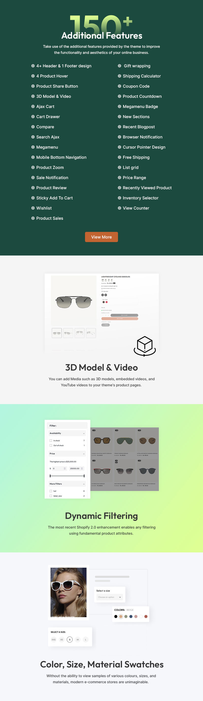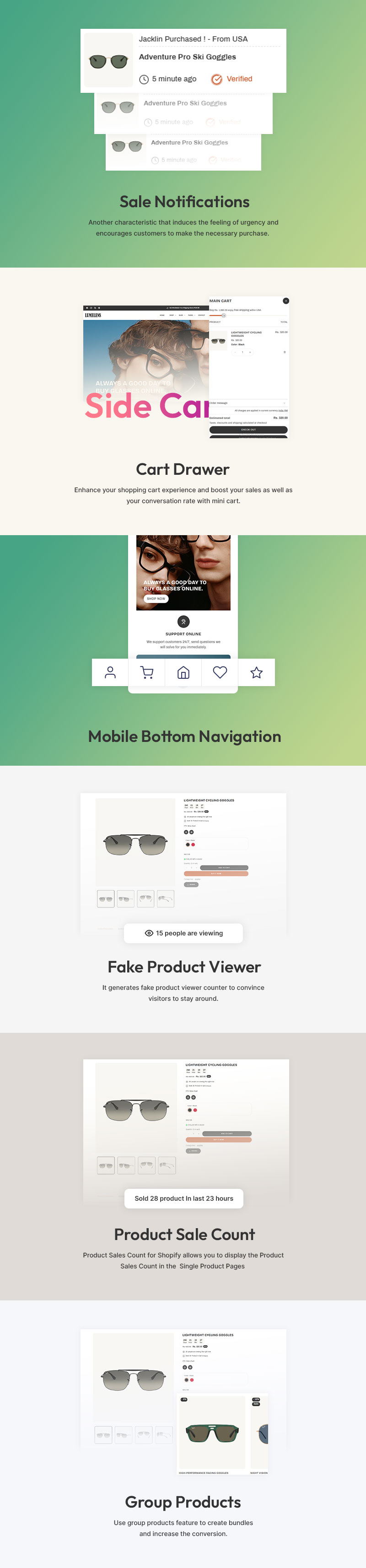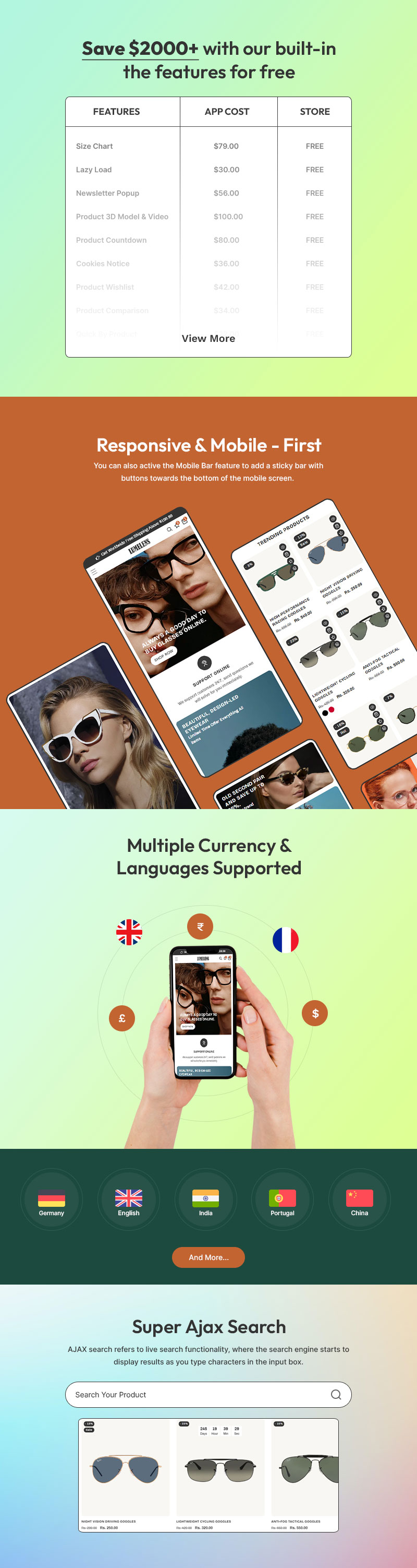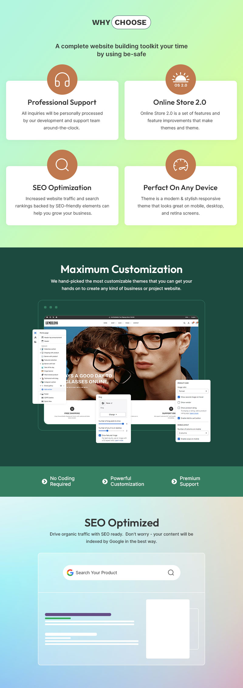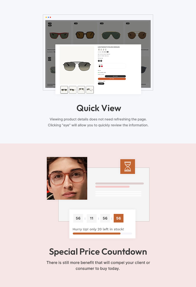 Customization is effortless with LumeLens’s drag-and-drop builder, allowing you to adjust colors, fonts, and layouts to match your brand’s identity. The advanced filtering system enables customers to browse by frame shape, lens type, material, and style, ensuring a smooth shopping journey. Each product page is optimized for maximum engagement and sales, featuring detailed descriptions, lens benefits, size guides, customer reviews, and virtual try-on integrations.
