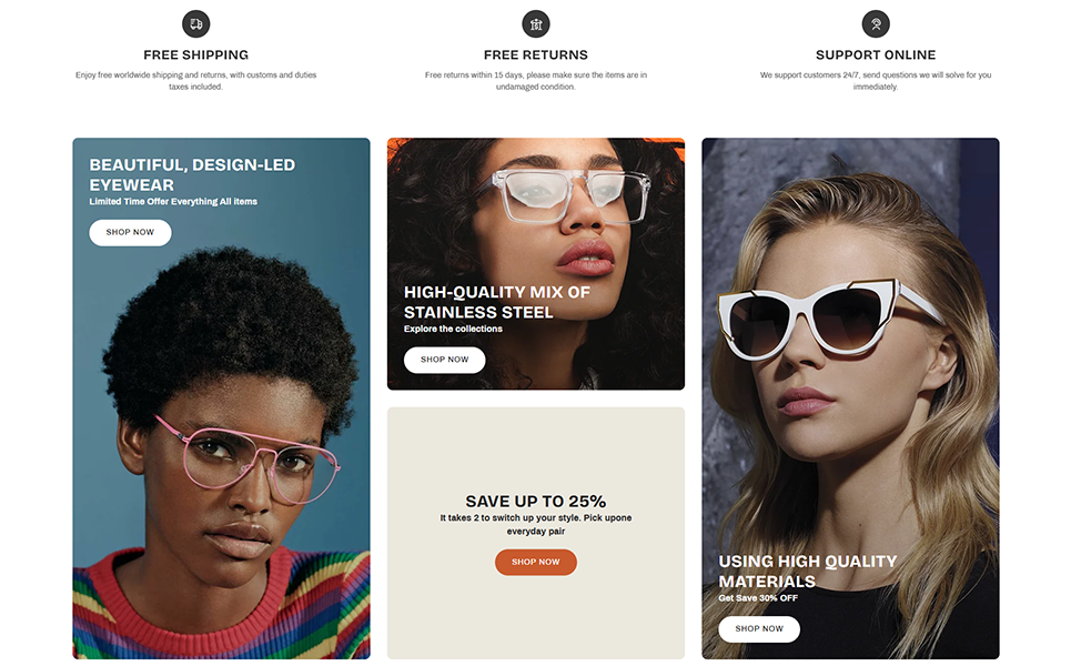 Perfect for sunglass retailers, optical stores, and luxury eyewear brands, LumeLens blends fashion, functionality, and eCommerce innovation to create a high-performing online eyewear store.