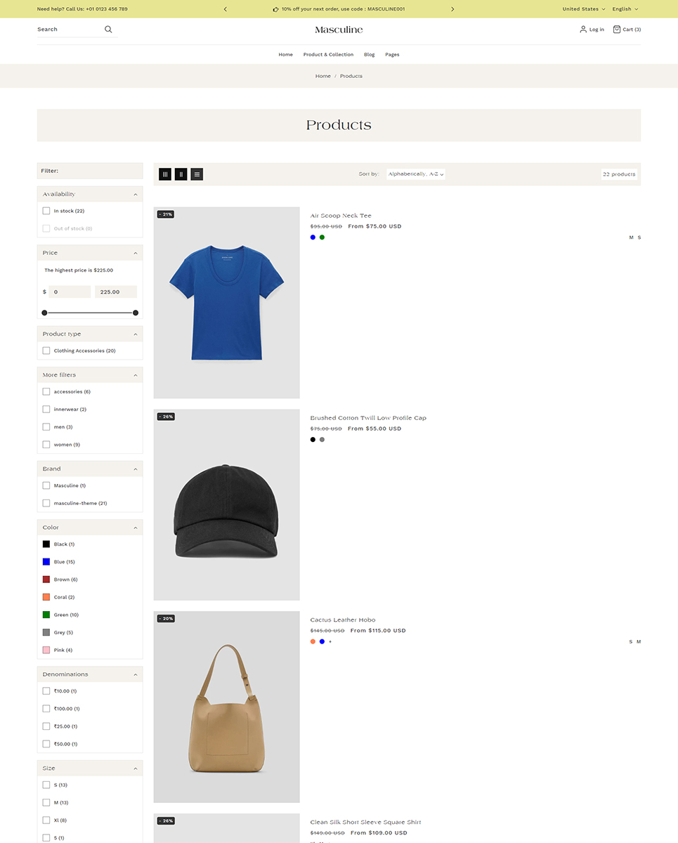 Masculine’s sleek, stylish, and masculine design is tailored to highlight the quality and sophistication of your products, making it an ideal choice for men's fashion retailers. The theme's mobile-first approach guarantees a seamless shopping experience across all devices, including desktops, tablets, and smartphones, ensuring you reach customers wherever they are. Customization is made easy with Masculine; you can effortlessly modify fonts, colors, and layouts to reflect your brand's unique identity without any coding knowledge. The intuitive drag-and-drop sections allow for creating a personalized and distinctive look, ensuring your store stands out.