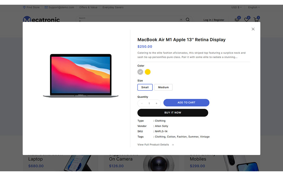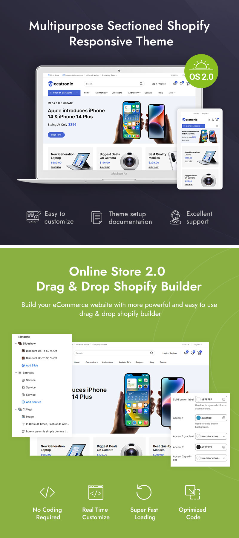Built on the newest Shopify 2.0 framework, Mecatronic ensures faster loading times, greater flexibility, and enhanced performance. It supports modular design and section-based editing, allowing store owners to customize pages effortlessly. Mecatronic incorporates AJAX technology like ajax cart, live search, produc quickview and advanced filter, enabling real-time interactions without page reloads.