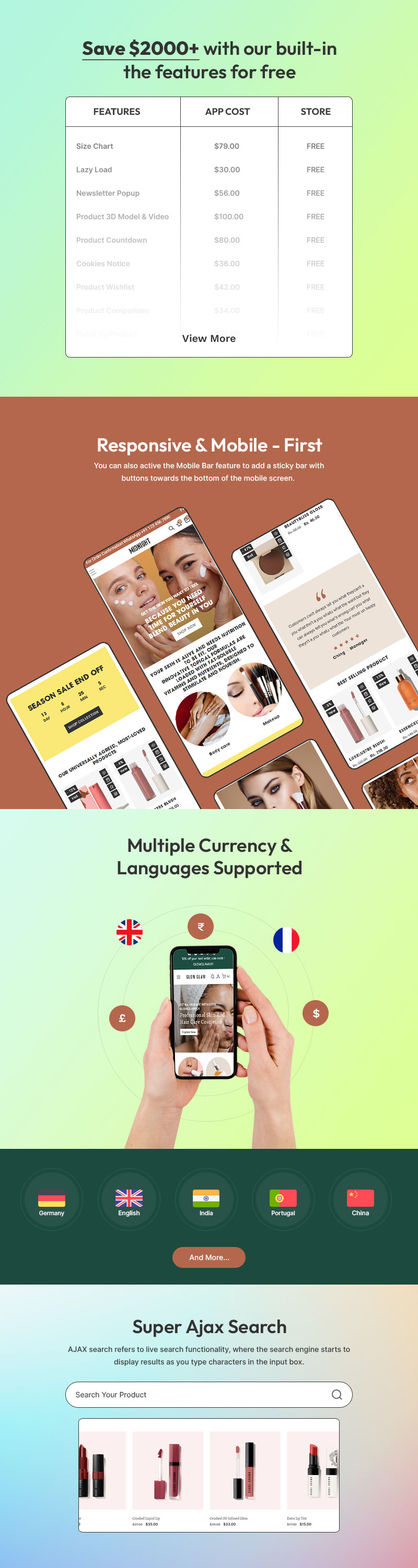 Boost engagement and sales with integrated marketing tools, including influencer promotions, shoppable beauty guides, and time-limited offers. Social media integration allows easy sharing of beauty trends and tutorials across Instagram, TikTok, and Pinterest, maximizing brand exposure. Multi-currency and multi-language support help expand your store’s reach to a global audience.