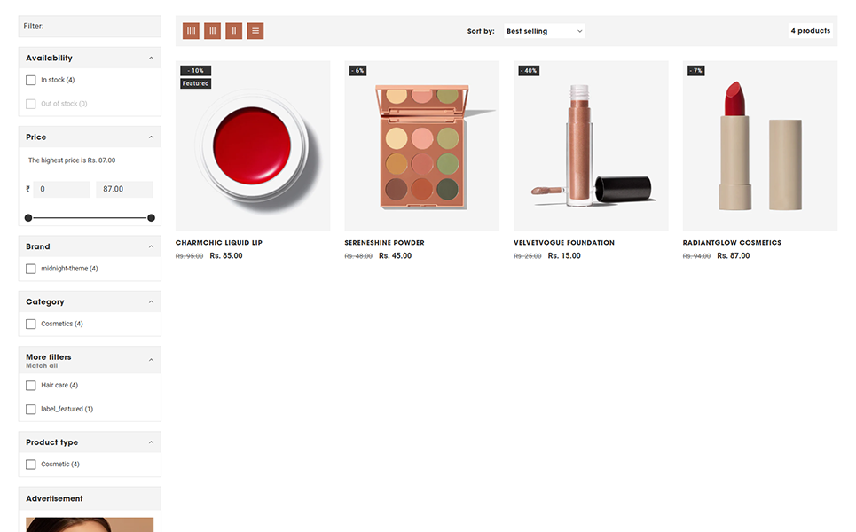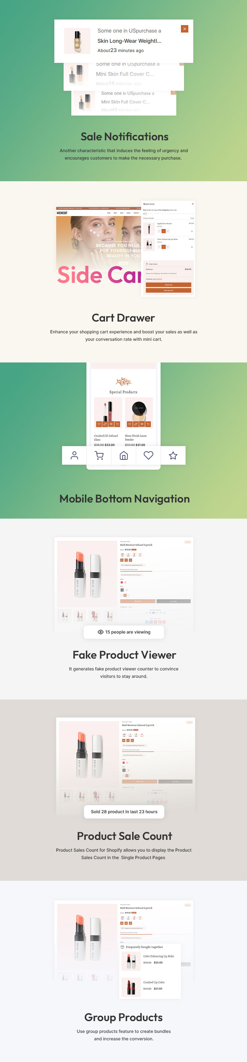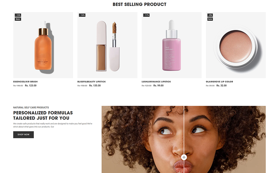 Built for effortless customization, Midnight offers a drag-and-drop builder, flexible layouts, and a smart filtering system that lets customers browse by skin type, beauty concerns, or trending collections. Each product page is designed to drive conversions, featuring ingredient breakdowns, beauty tips, tutorials, and real customer reviews.