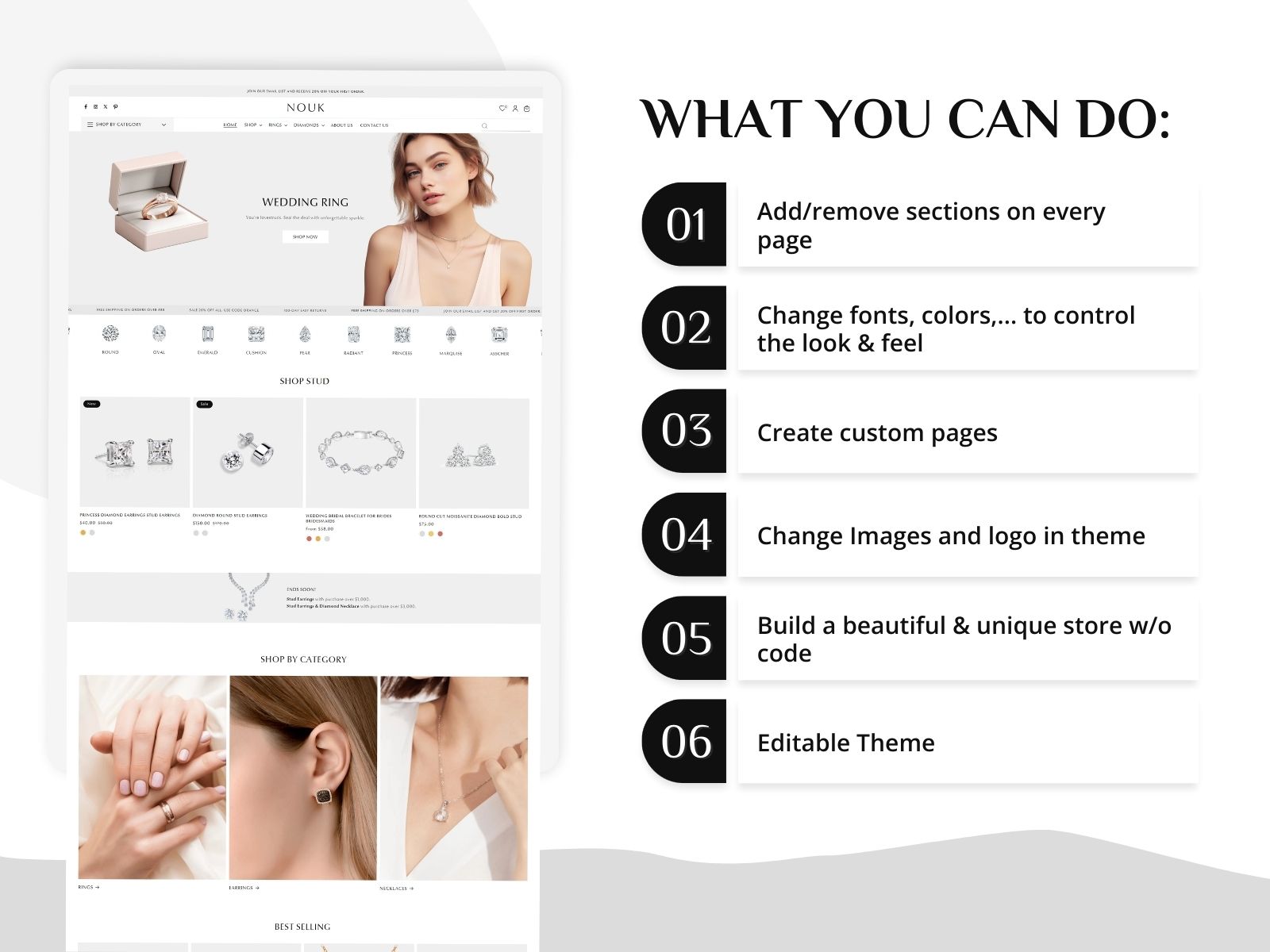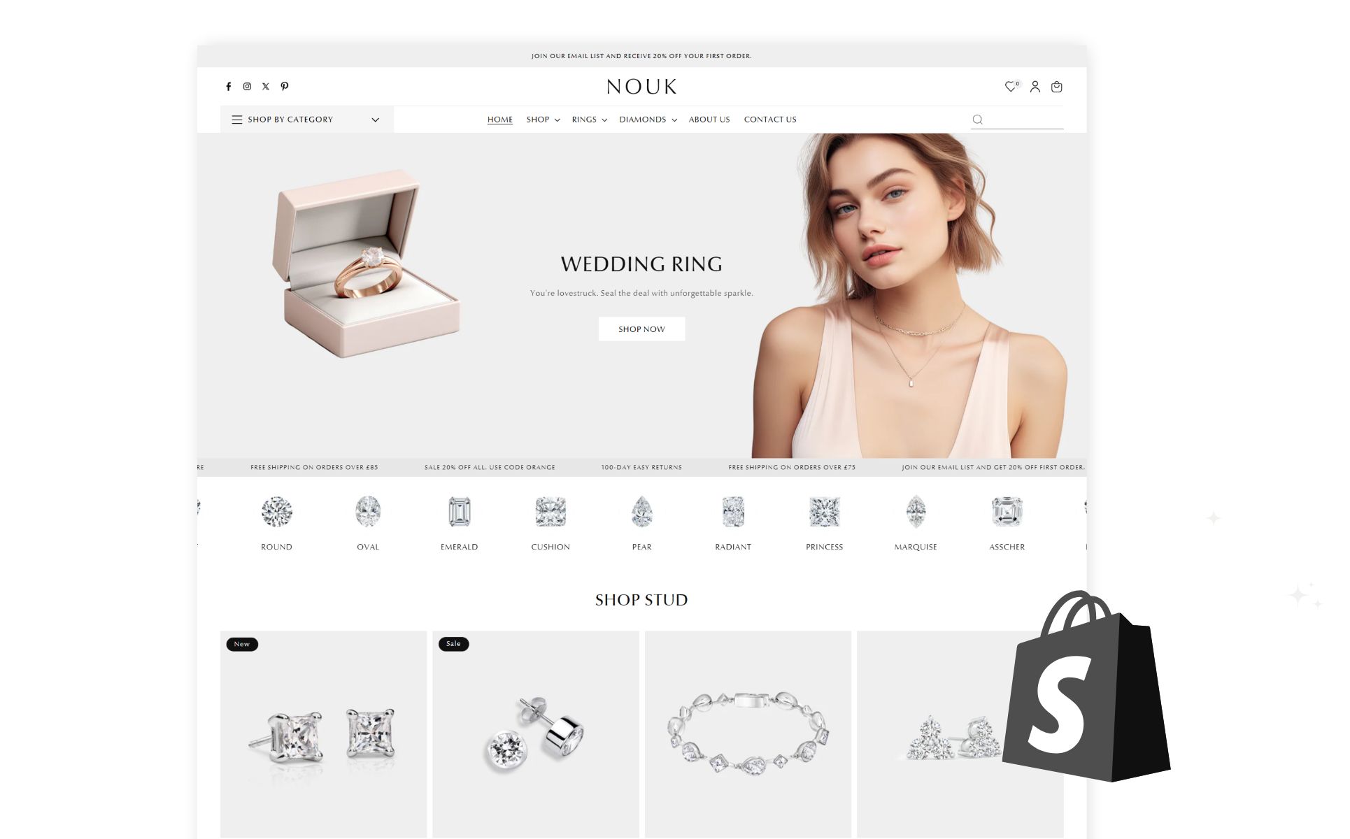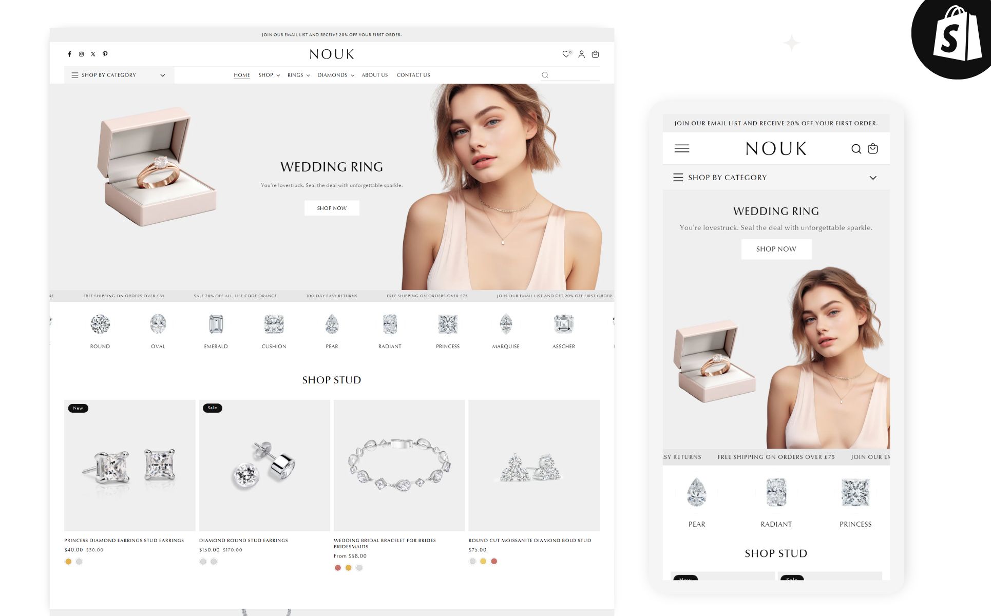 Nouk is a beautifully crafted Shopify theme designed specifically for jewelry stores. Built on Shopify OS 2.0, Nouk offers a modern, sleek, and user-friendly interface that enhances your customers' shopping experience while providing you with all the tools needed to grow your business.