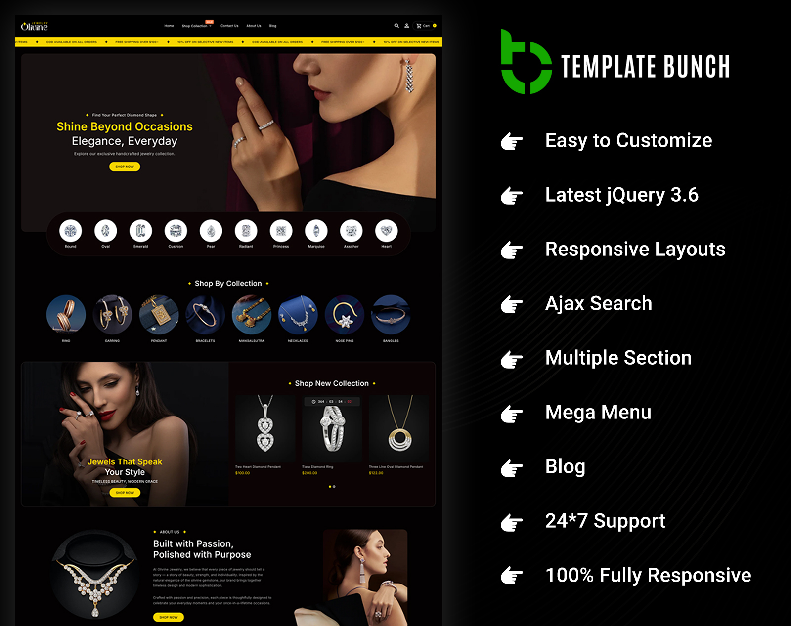 Olivine Jewelry - Multipurpose Responsive Shopify Theme is a luxurious and modern solution tailored for online jewelry stores, fashion accessories, and high-end boutiques. Designed to elevate your brand, Olivine offers a clean, elegant layout with a focus on product presentation and user experience. Built on the powerful Bootstrap framework, this theme is 100% responsive, ensuring your store looks flawless on all devices—from mobile to desktop.