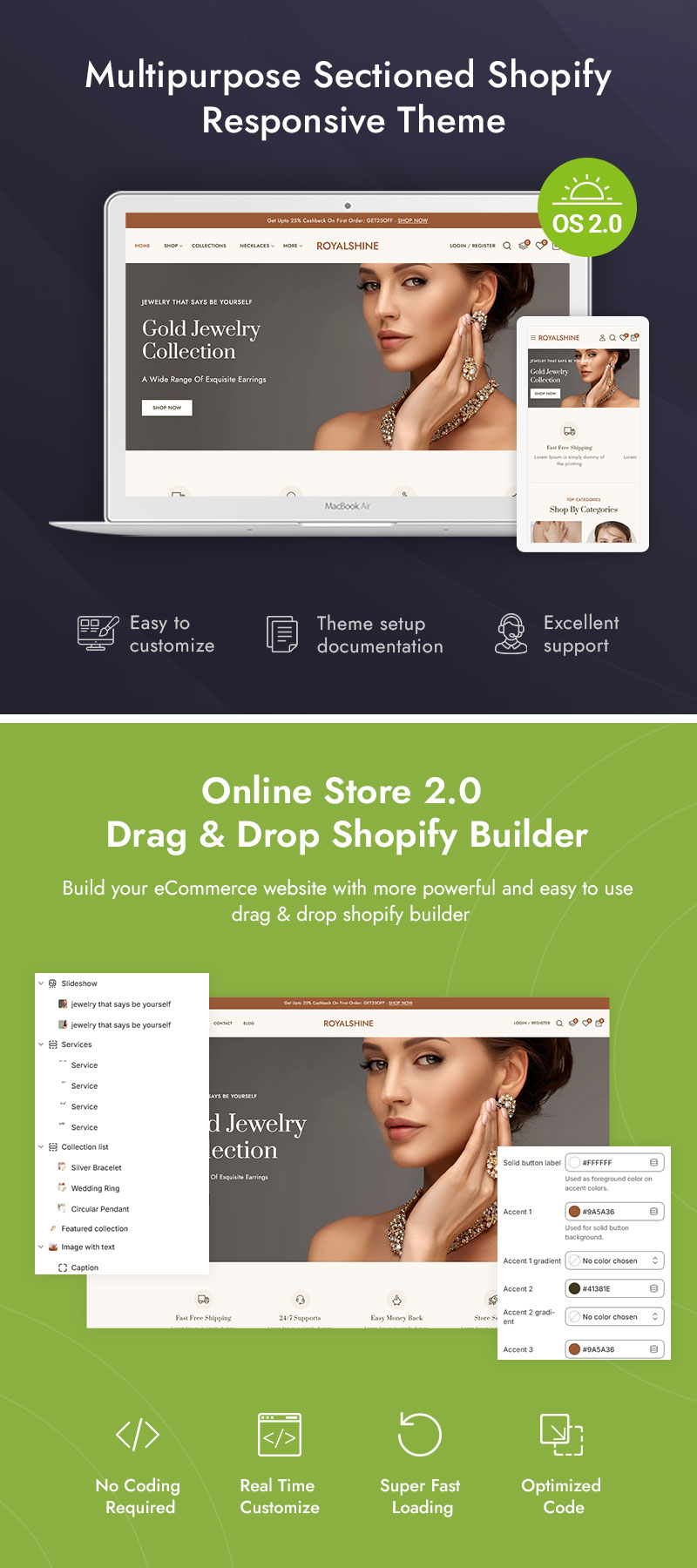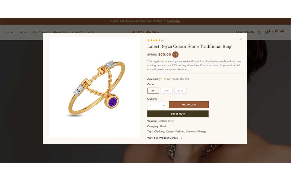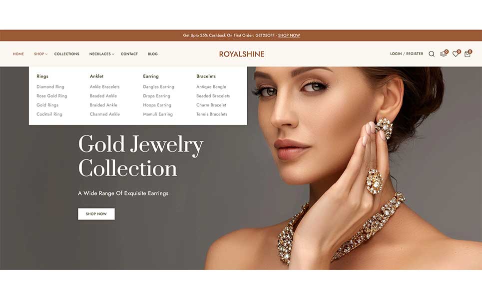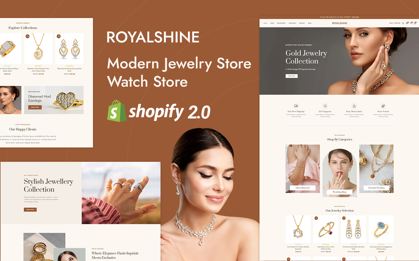 Royalshine - Jewelry Fashion Store Shopify 2.0 Responsive Theme is a stunning and elegant eCommerce solution crafted especially for online jewelry stores, fashion boutiques, and luxury accessory brands. Built on the powerful Shopify 2.0 framework, this theme offers a visually captivating layout with refined design aesthetics that perfectly highlight premium products like gold and diamond jewelry, handcrafted ornaments, fashion accessories, watches, and more.