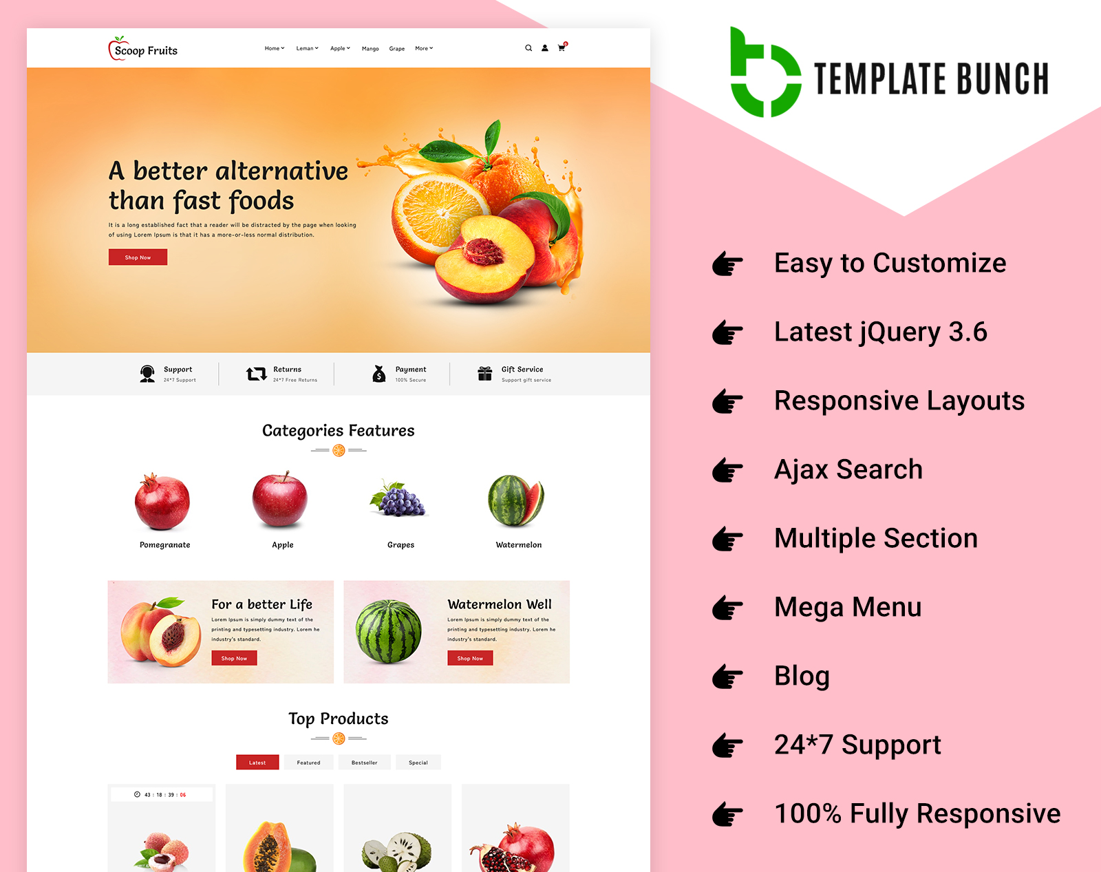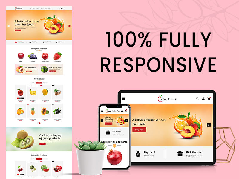 The Scoop Fruits e-commerce template is designed to offer a seamless and delightful shopping experience. Featuring a working contact form powered by Ajax, it ensures efficient communication. This template is easy to customize, with well-commented files to guide your adjustments. Its minimal and clean design provides an awesome, unique look that stands out. The template displays flawlessly across all modern browsers and devices, guaranteeing a consistent user experience. It comes with ready homepages to help you get started quickly. The CSS3 table-less design enhances both functionality and aesthetics, and 24/7 support is available to assist you whenever needed. This template combines style and usability, making it ideal for creating a standout e-commerce site for fruits.
