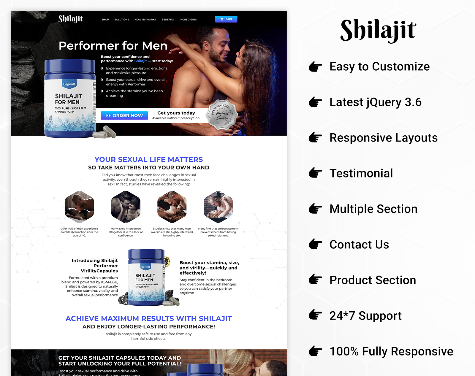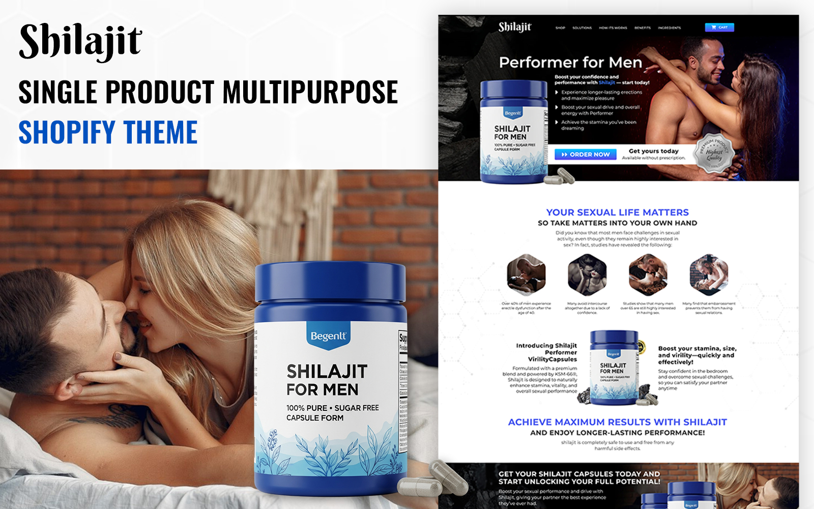 Shilajit For Men - Single Product Multipurpose Shopify Theme is a powerful and modern eCommerce solution crafted for brands that want to highlight a premium product with style and confidence. Designed especially for health, wellness, and herbal supplement stores, this Shopify theme offers a professional layout that focuses on product presentation and conversion. The theme’s minimal and clean design ensures your product takes center stage, while the high-performing Bootstrap framework guarantees smooth responsiveness across all modern devices and browsers.