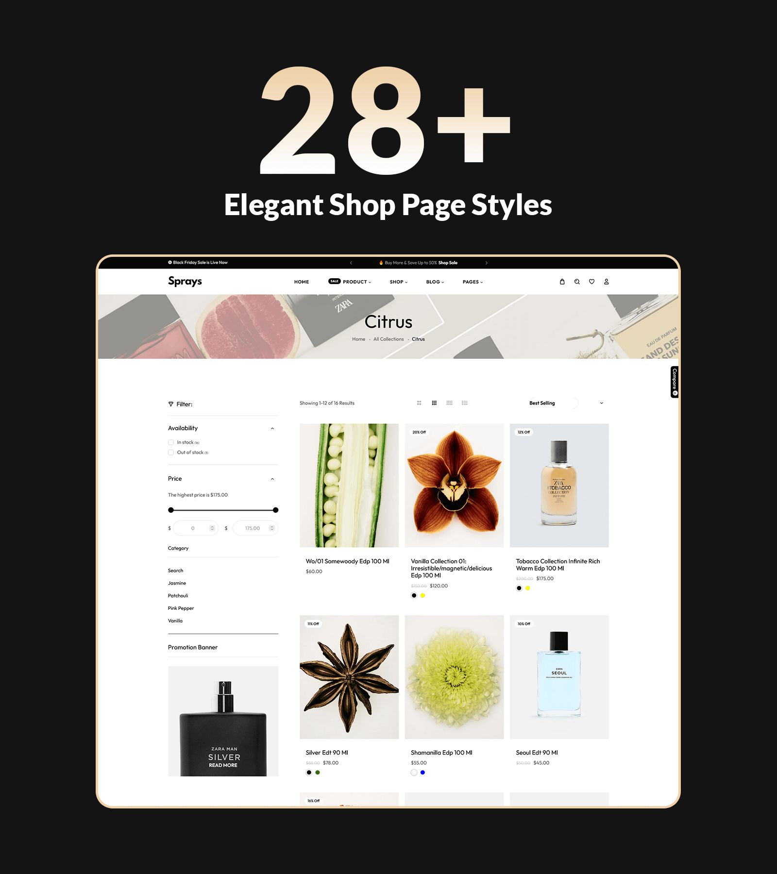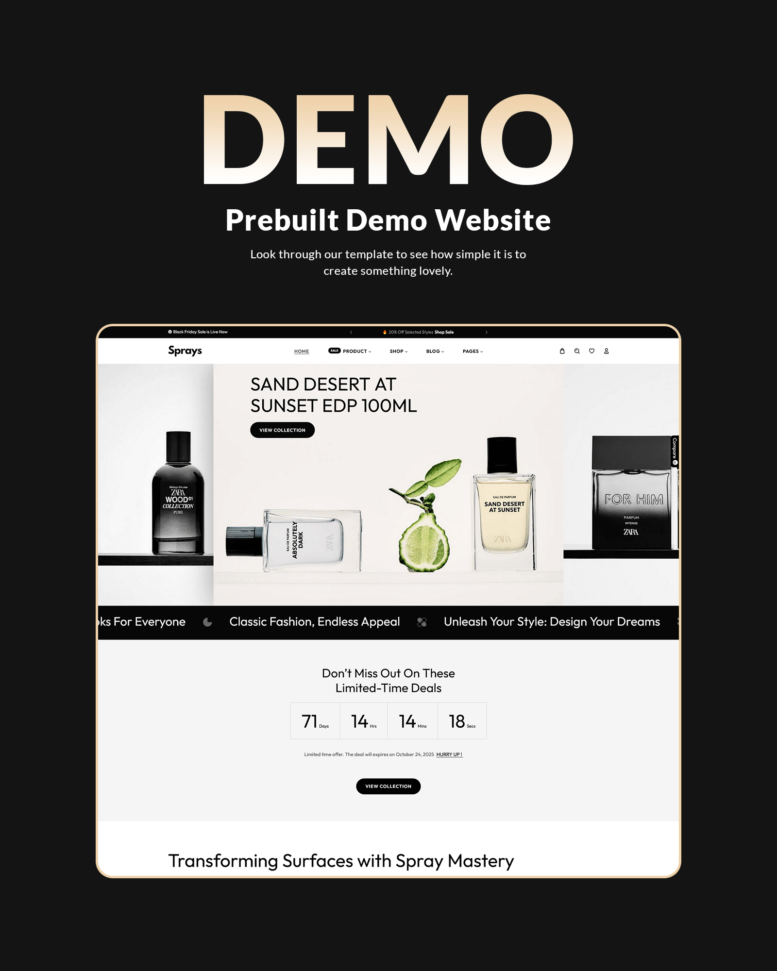 From timeless fragrances to skincare staples and makeup favorites, Perfumes embraces every beauty preference. Perfect as a foundation for your custom projects, Sprays is the ultimate Shopify theme for building elegant, high-converting perfume and fragrance stores.
