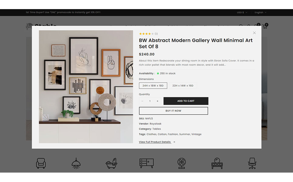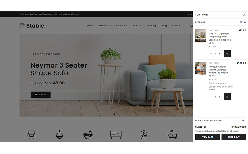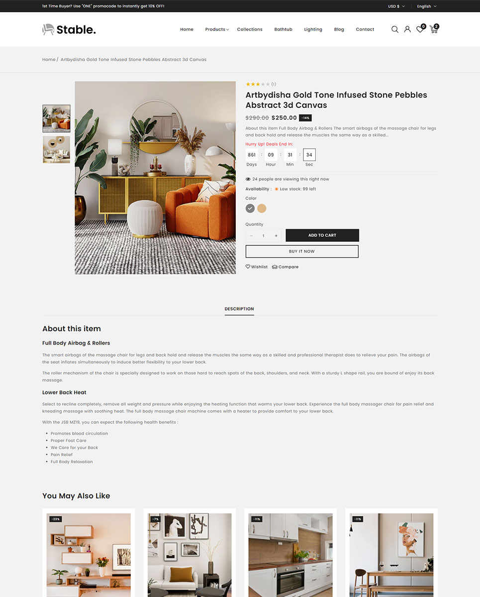 Stable theme included AJAX-Powered Features like AJAX Add to Cart, AJAX Live Search and AJAX Product Filtering for Seamless Shopping experience for your customers. Showcase your furniture and decor pieces in style with Zoom-in & high-resolution images on product page and view detail about product from any page with product quickview feature.