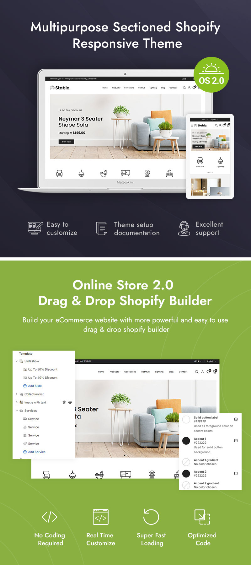 Built with Shopify 2.0’s latest features, this theme offers flexible sections, drag-and-drop customization, AJAX-powered functionality, and lightning-fast performance. Whether you're selling furniture, lighting, home accessories, or decor items, Stable is the perfect theme to showcase your products and grow your business online.