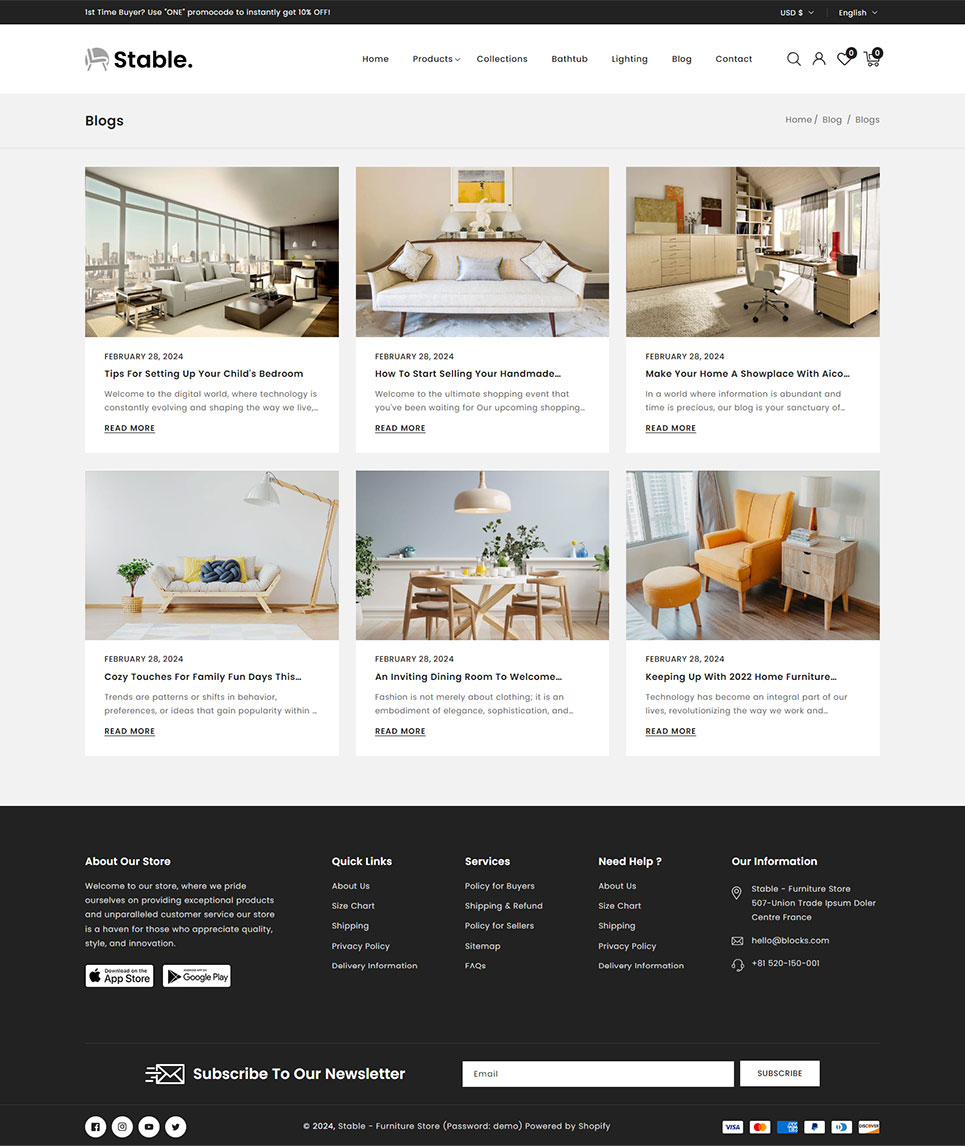Stable is a sleek, modern, and highly functional Shopify 2.0 theme designed specifically for furniture stores, interior design shops, home decor retailers, and lifestyle brands. With a minimalist yet elegant design, Stable provides a visually stunning layout that enhances product presentation and improves the shopping experience.