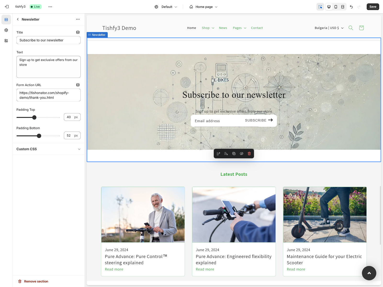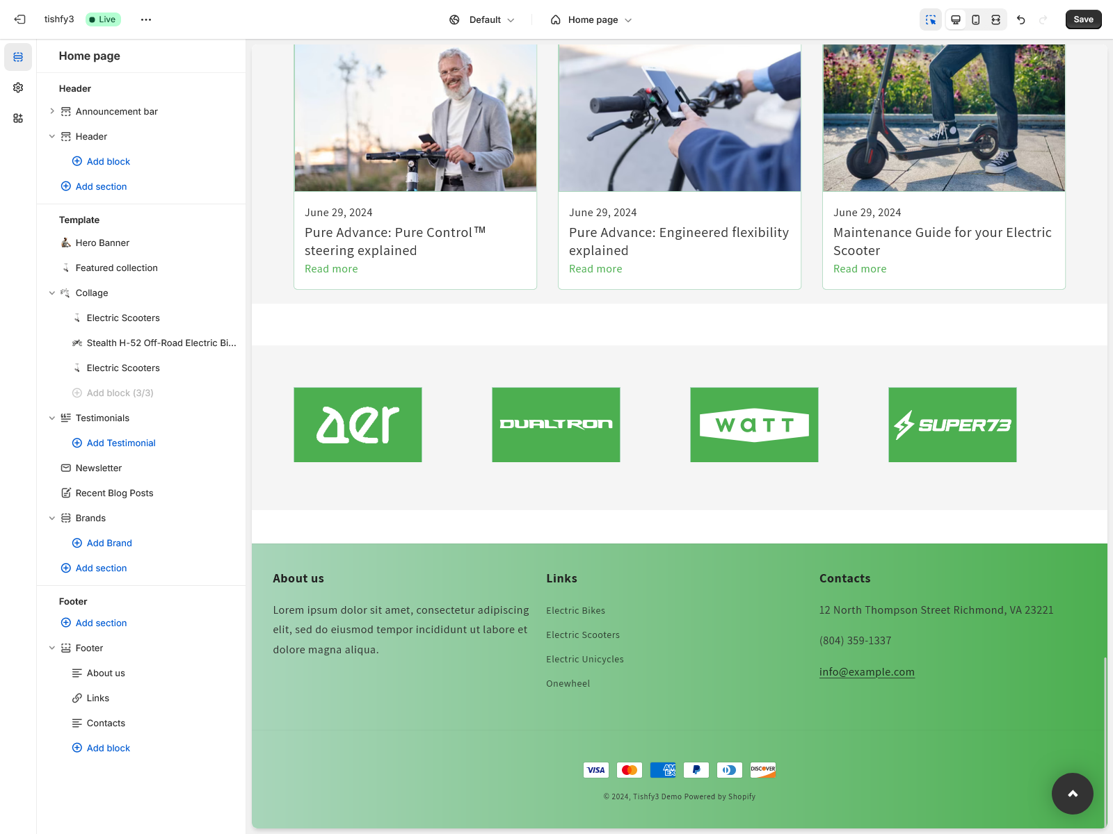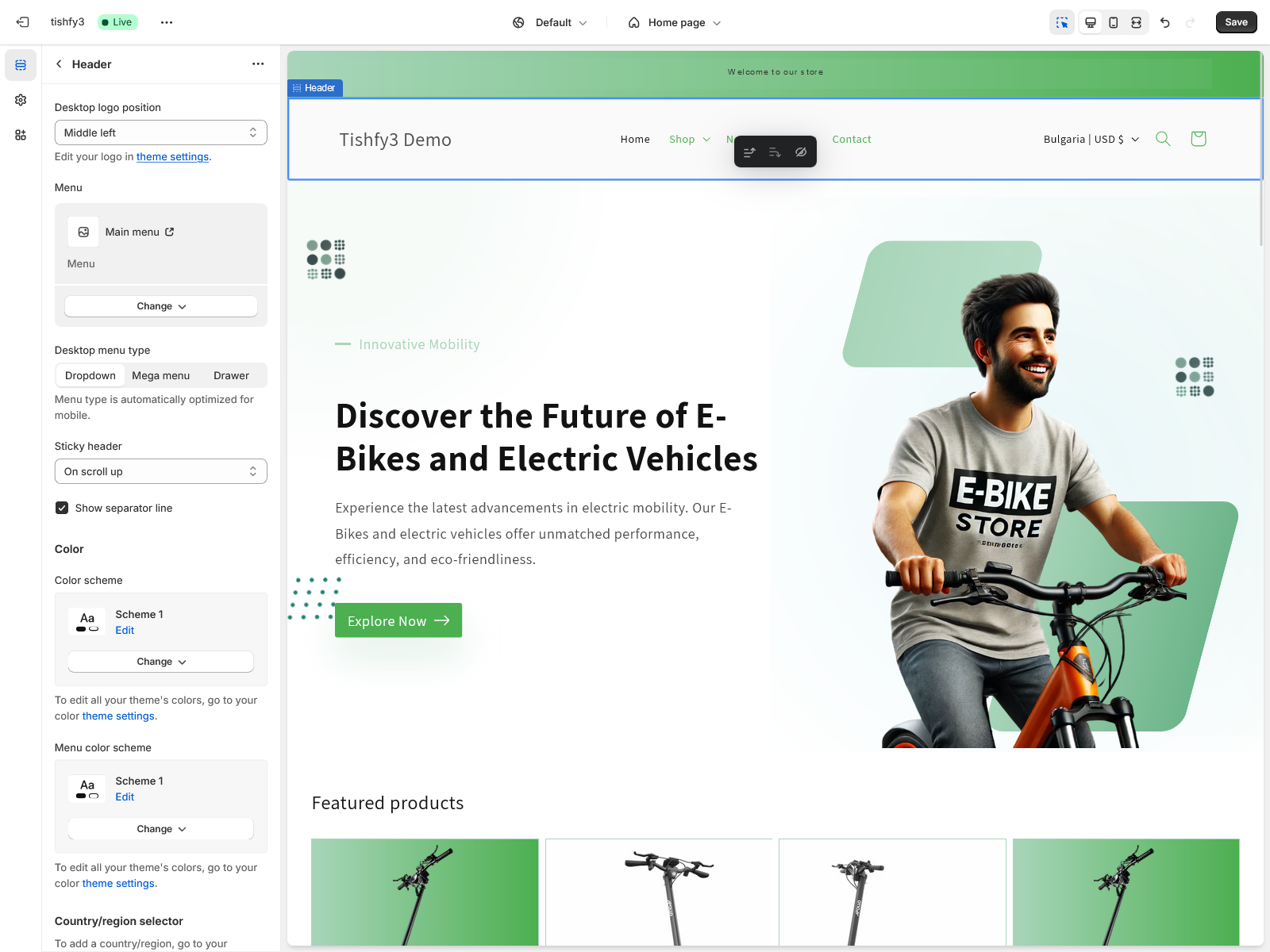 Welcome to Tishfy3, a Shopify 2.0 theme meticulously designed to cater to the growing market of E-Bikes and Electric Vehicles. Built on the robust foundation of Shopify's Dawn theme, Tishfy3 integrates additional sections and blocks to provide an unparalleled shopping experience for customers and a versatile, user-friendly platform for store owners. Whether you are launching a new store or revamping an existing one, Tishfy3 is engineered to meet your needs with style and functionality.