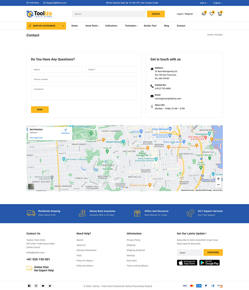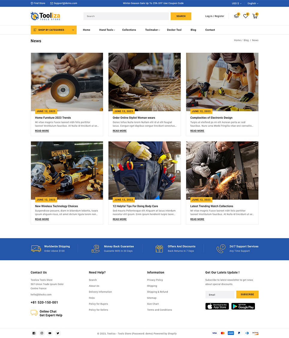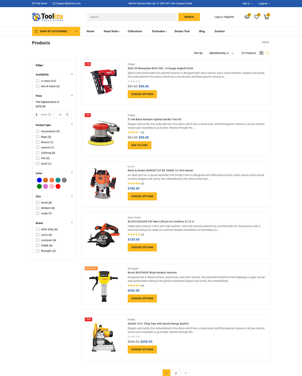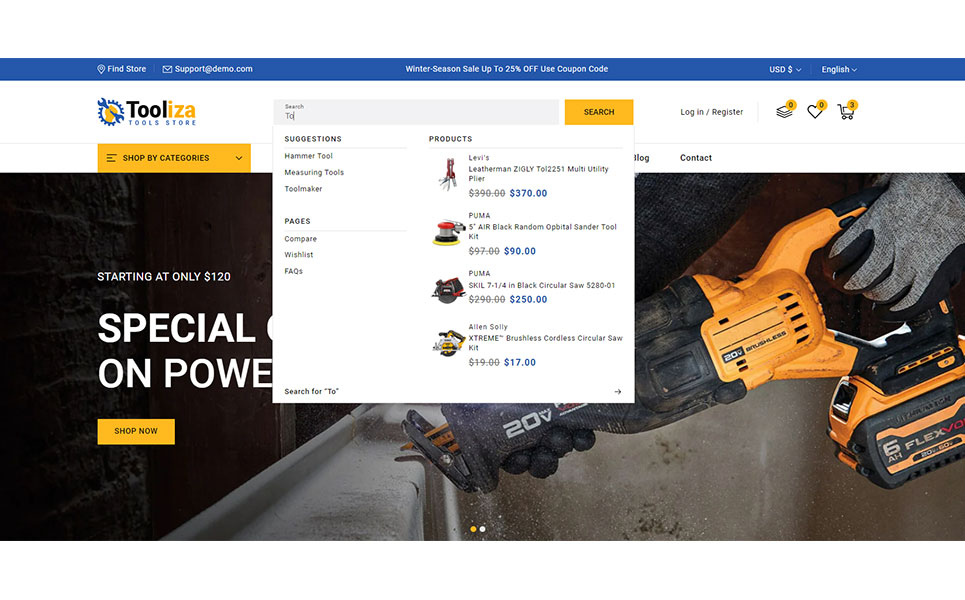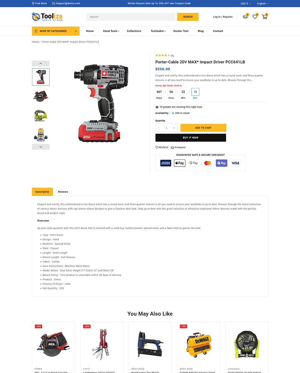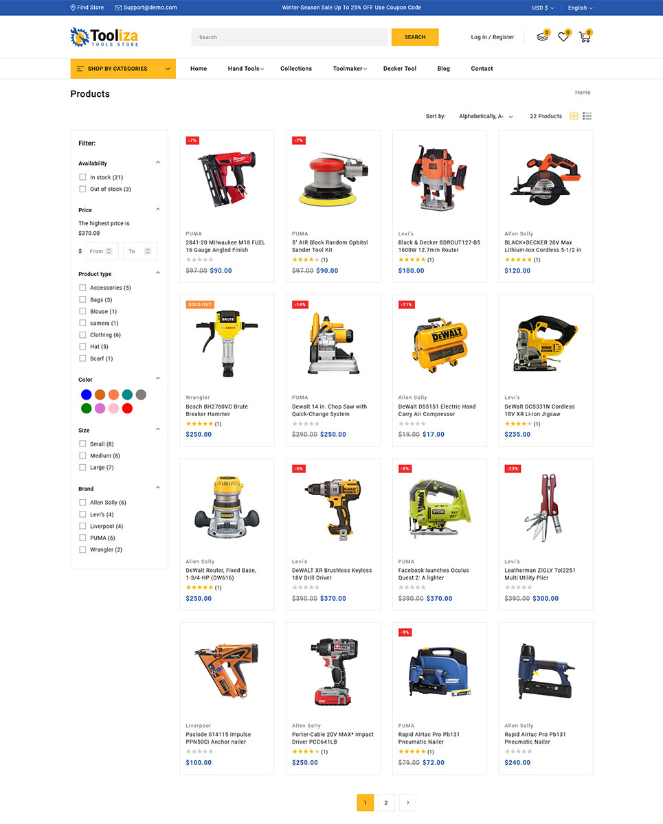 Tooliza is a premium Shopify 2.0 theme with an elegant and eye-catching design that is perfect for presenting hardware items, tools stores, plumbing, machine, garden, and other tools as well as automobiles and their accessories. The theme is created using the finest Shopify section builder, allowing you to create any section on any page using the available admin options. In addition, Tooliza provides a variety of helpful features made especially for certain products.