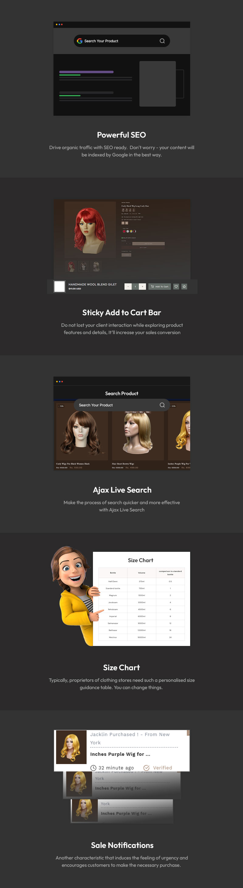Customization is effortless with Vertex’s advanced drag-and-drop builder, enabling you to refine color schemes, typography, and layouts to match your brand’s aesthetic. The intelligent filtering system allows customers to explore by hair type, density, texture, length, color, and cap construction, ensuring a smooth and tailored shopping experience. Each product page is meticulously crafted to enhance engagement and conversions, featuring in-depth material details, expert styling tips, close-up zoom features, and step-by-step installation videos.