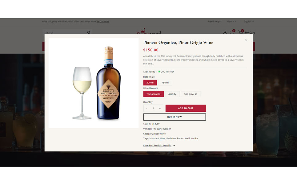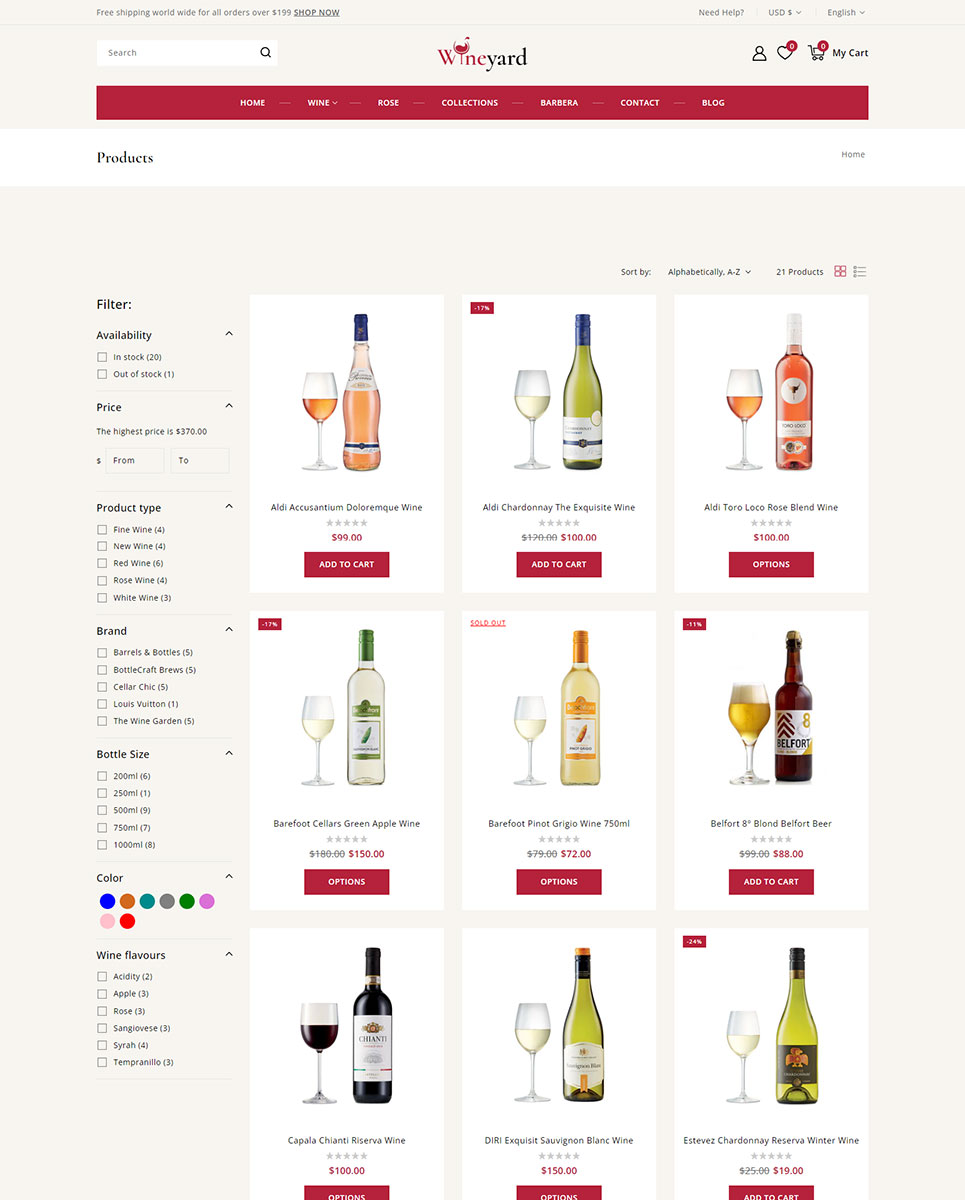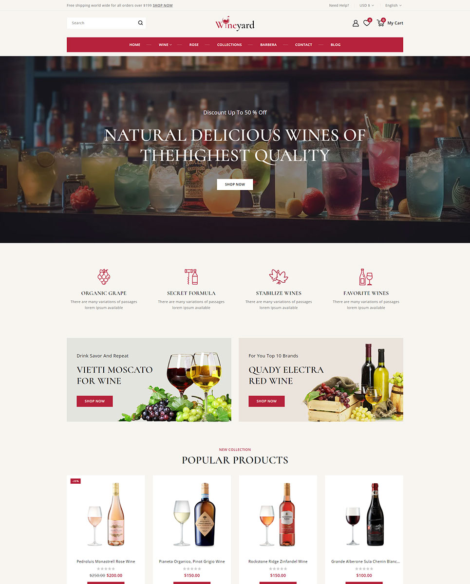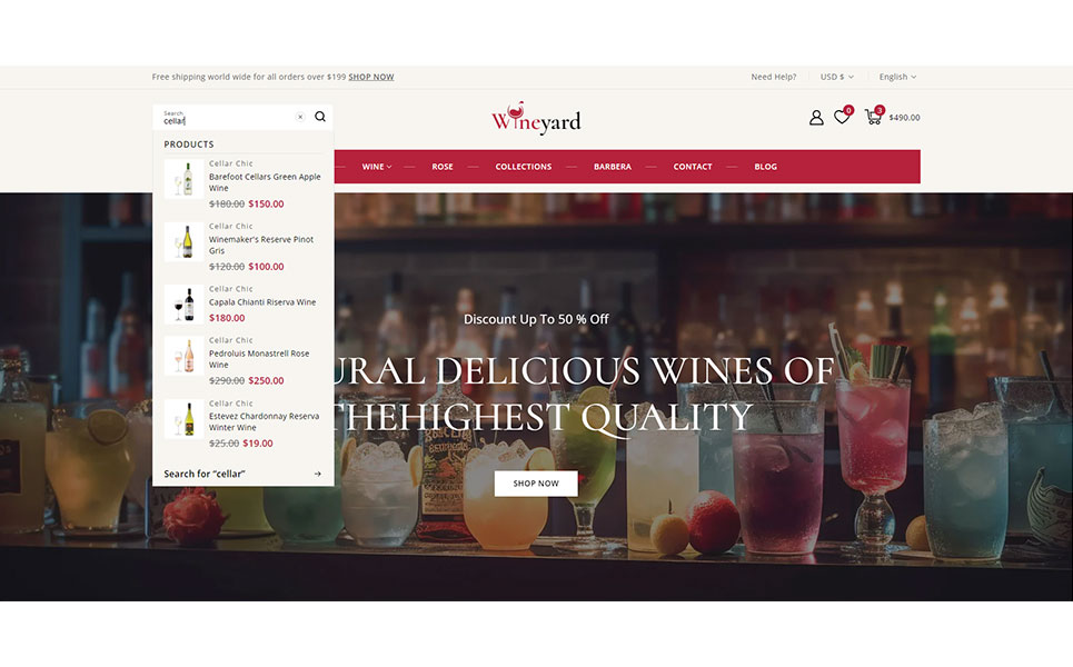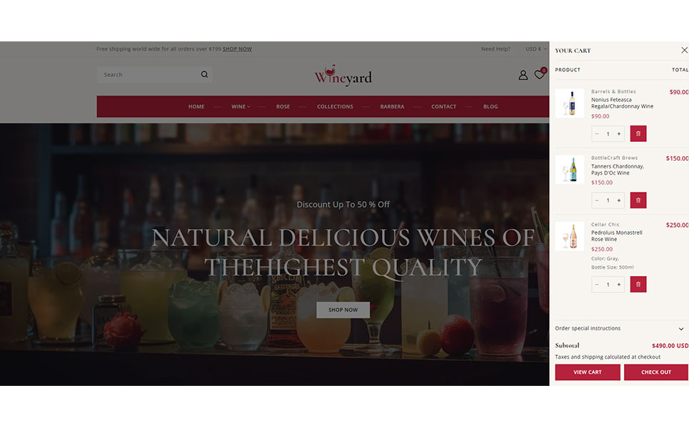 Wineyard is an elegant and professionally crafted Shopify 2.0 responsive theme designed for vineyards, wine shops, liquor stores, and premium beverage retailers. With a clean and sophisticated layout, Wineyard captures the essence of luxury and tradition, making it the perfect choice for showcasing wines, champagnes, spirits, and gourmet products in a visually appealing way.