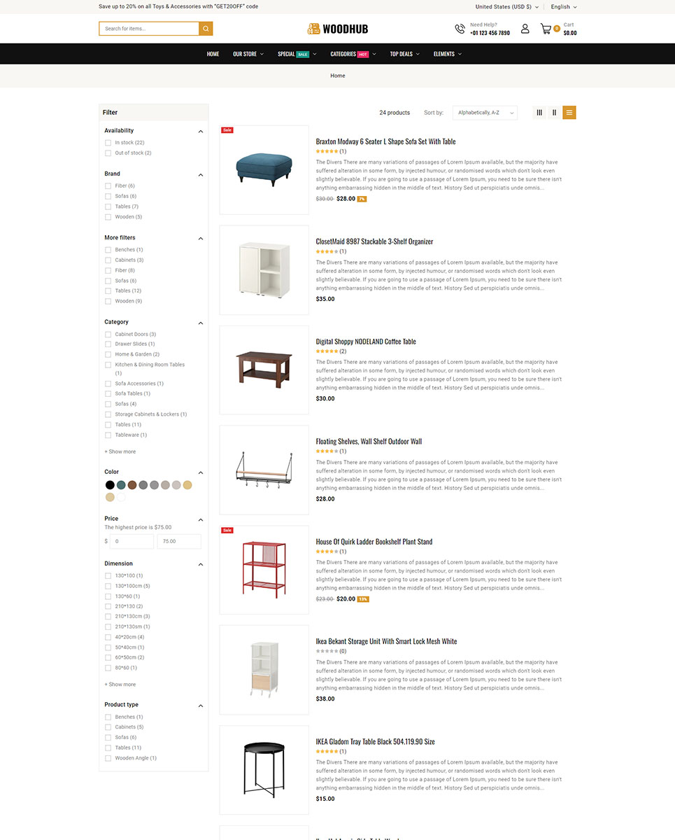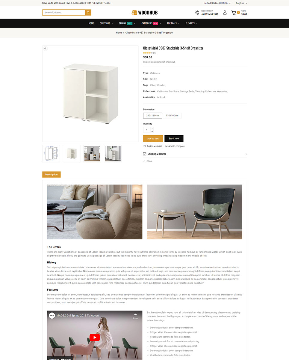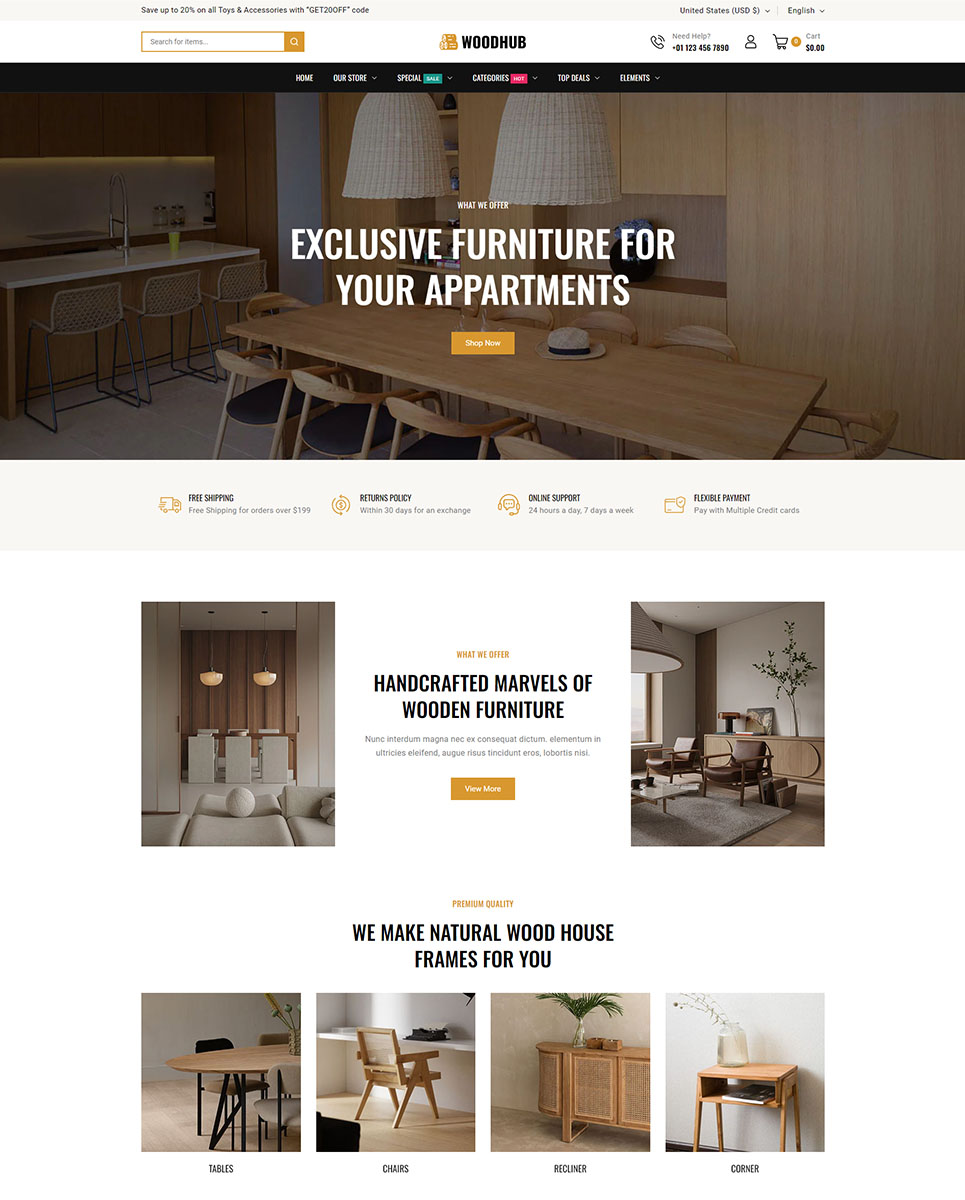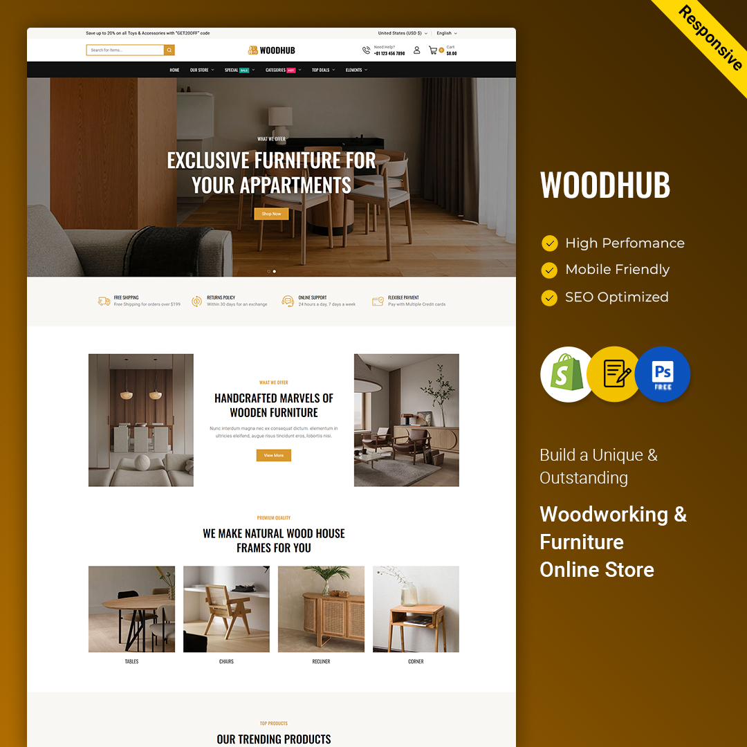 Crafted with elegance and functionality in mind, WoodHub is the ultimate Shopify 2.0 theme for wood and furniture stores, home decor shops, and interior design businesses. Designed to captivate your audience, this theme offers a seamless blend of modern aesthetics and user-friendly features, making it perfect for showcasing your high-quality products.