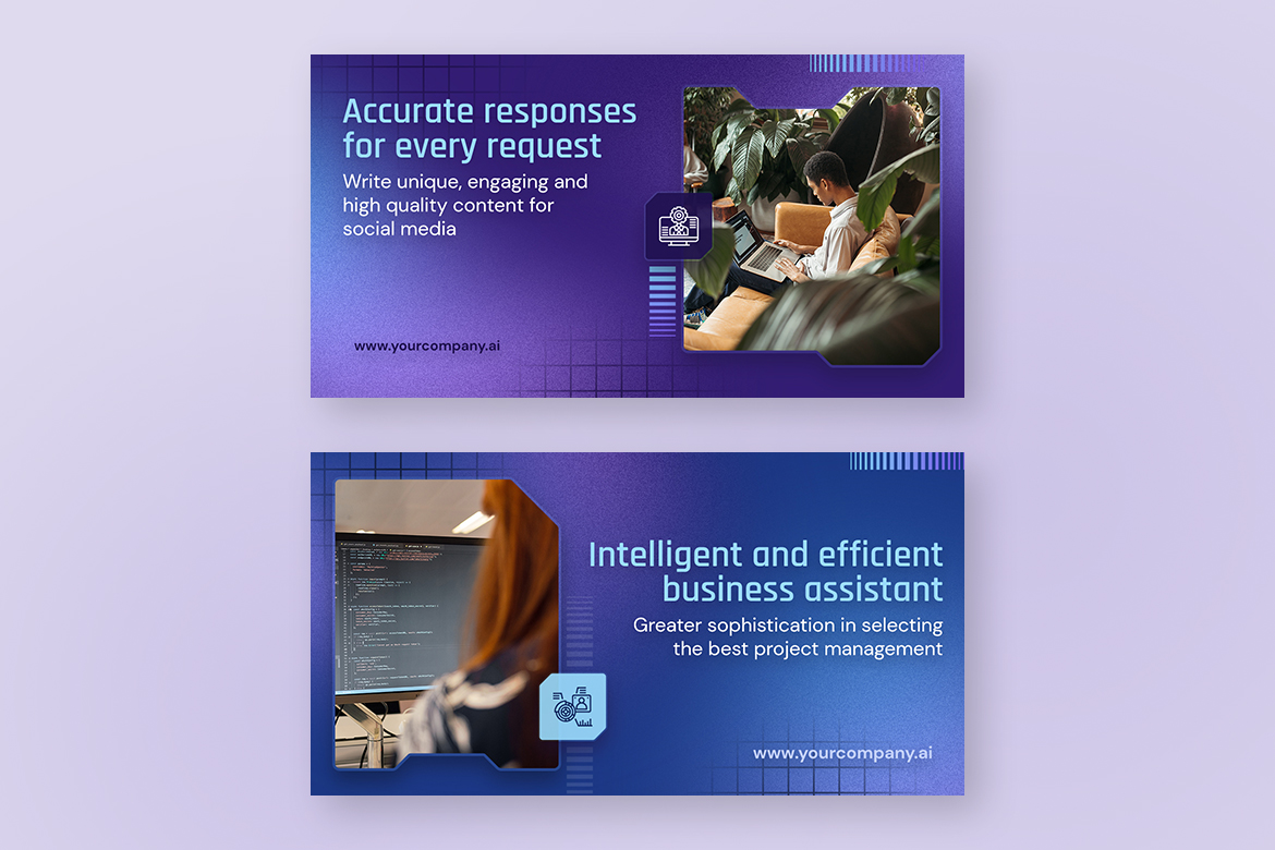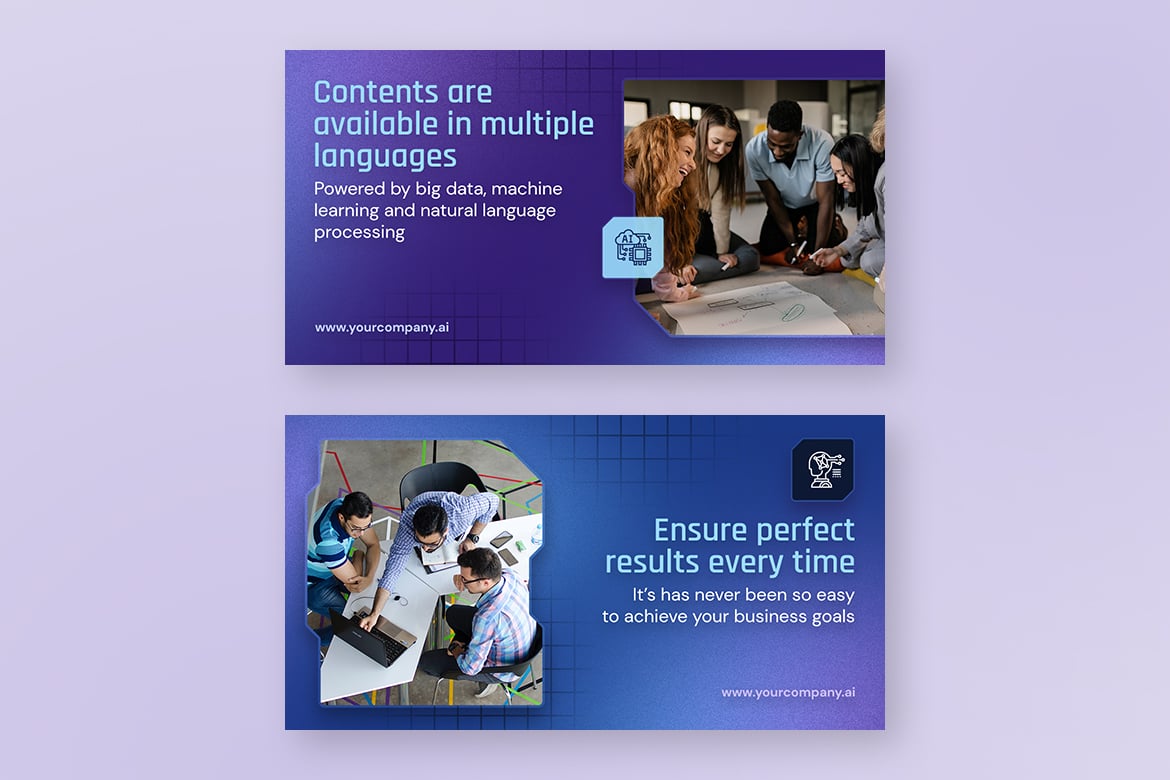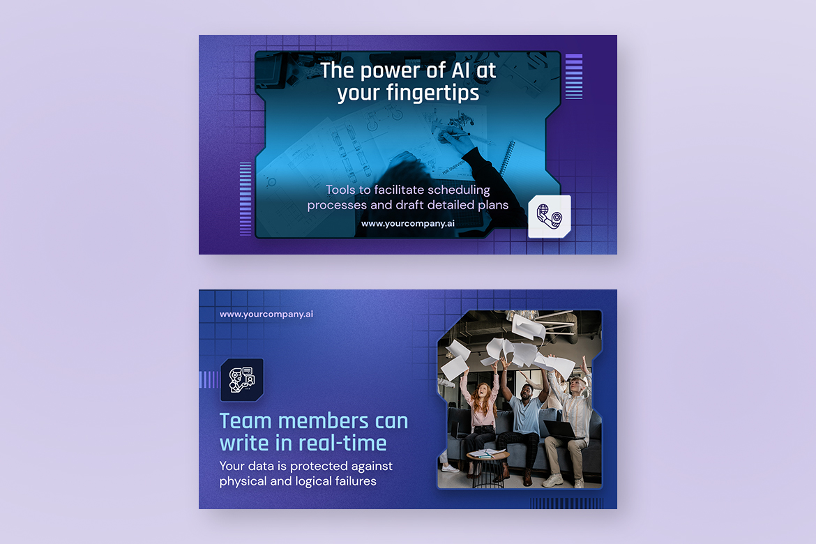 - Professional and Futuristic Design: Highlight the innovative nature of your brand with templates featuring AI-inspired elements like digital textures, neon highlights, and tech visuals.
