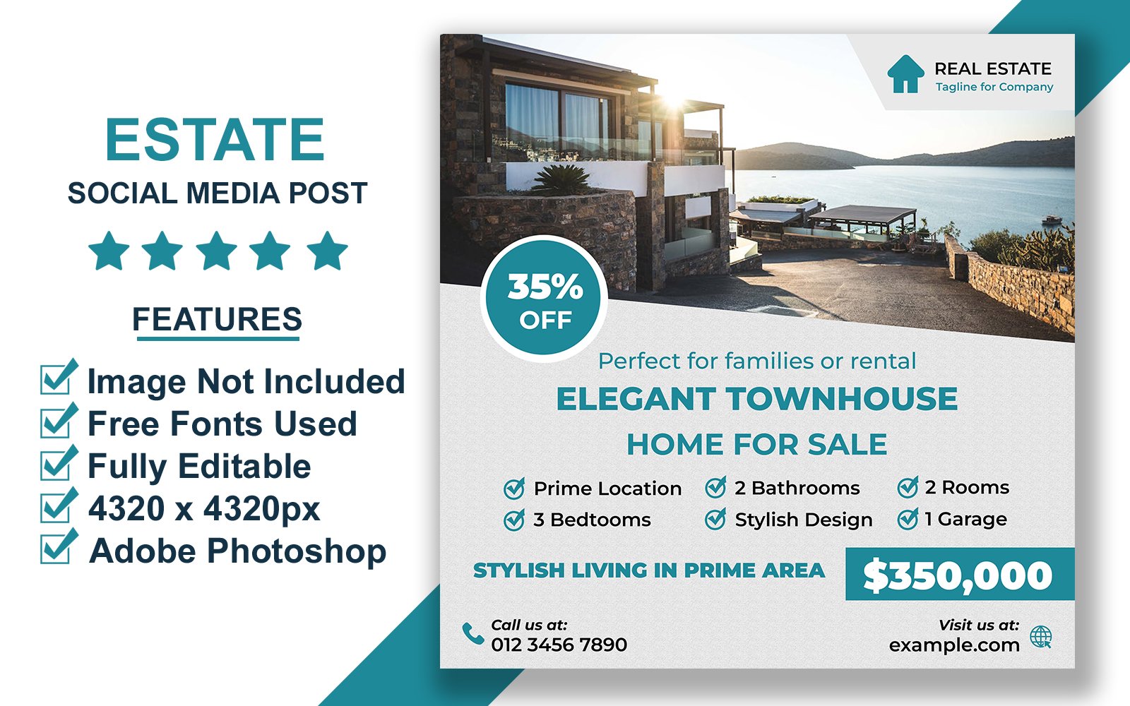 This Photoshop template is built to advertise apartments and flats for sale or rent. Real estate companies, brokers, and agents can use it to reach a digital audience through visually appealing posts.